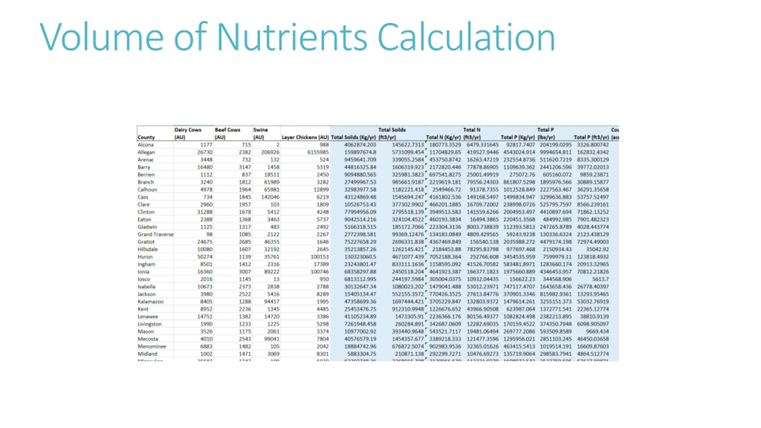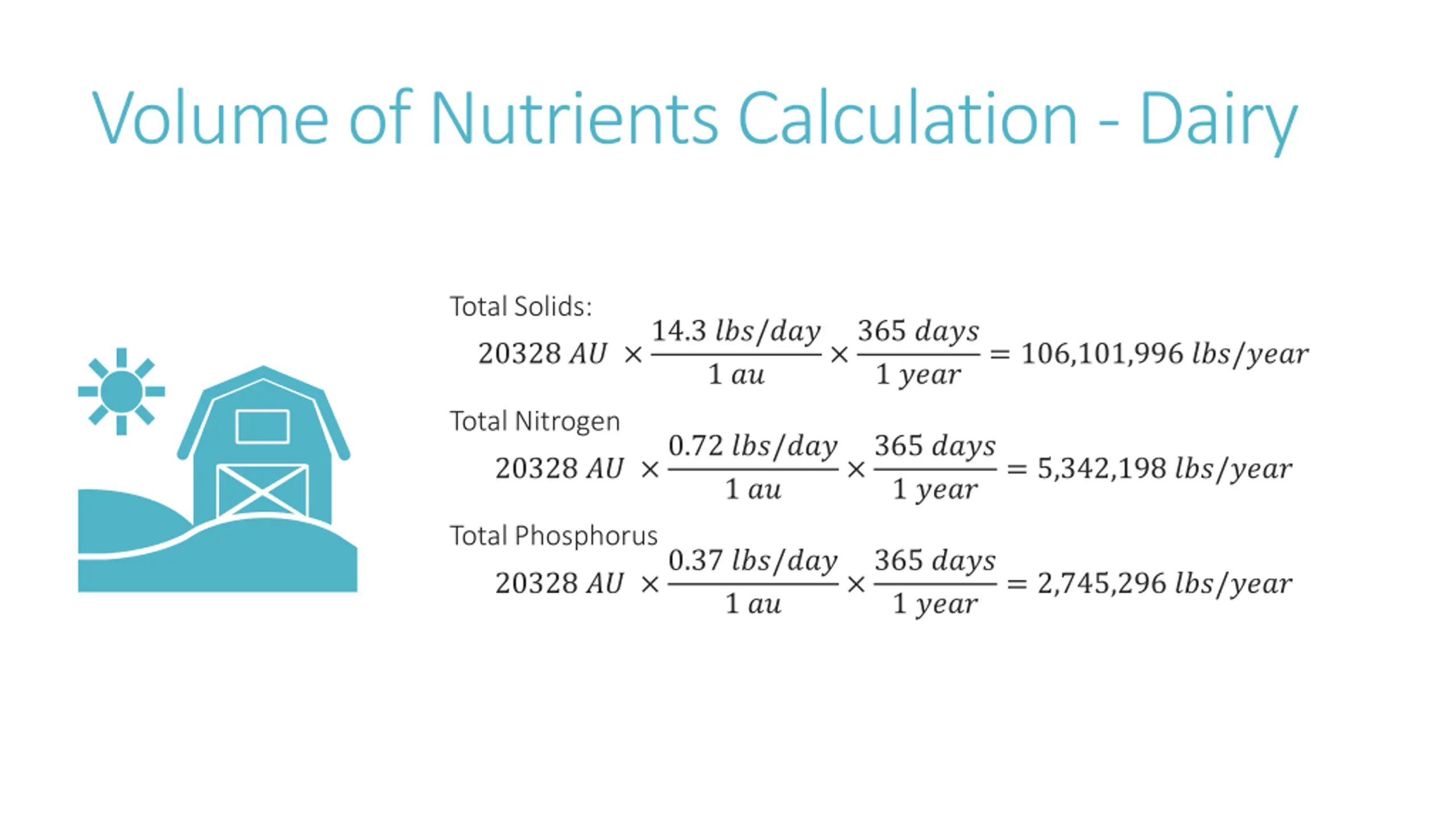 Volume of Nutrients Calculation - Dairy Total Solids: 20328 ?? 14.3 ???/??? 365 ???? 1 ???? = 106,101,996 ???/???? 1 ?? Total Nitrogen 20328 ?? 0.72 ???/??? 365 ???? 1 ???? = 5,342,198 ???/???? 1 ?? Total Phosphorus 20328 ?? 0.37 ???/??? 365 ???? 1 ???? = 2,745,296 ???/???? 1 ??