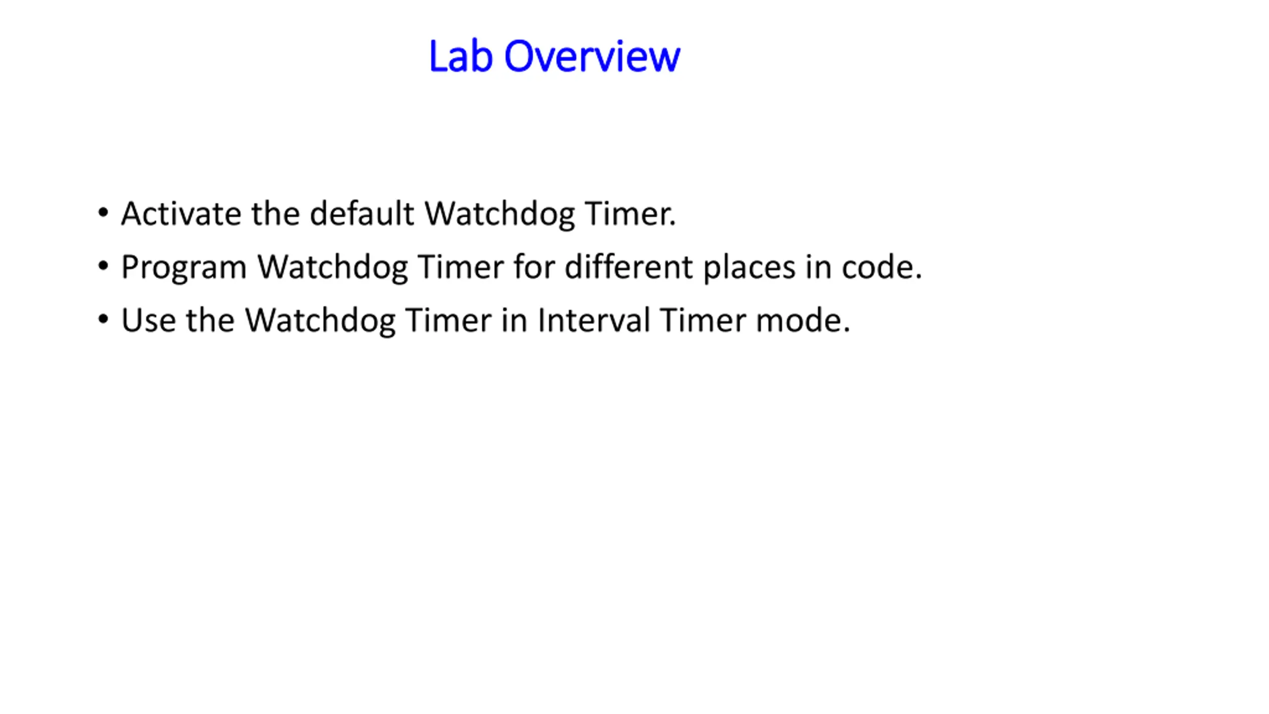 Lab Overview Lab Overview Activate the default Watchdog Timer. Program Watchdog Timer for different places in code. Use the Watchdog Timer in Interval Timer mode.