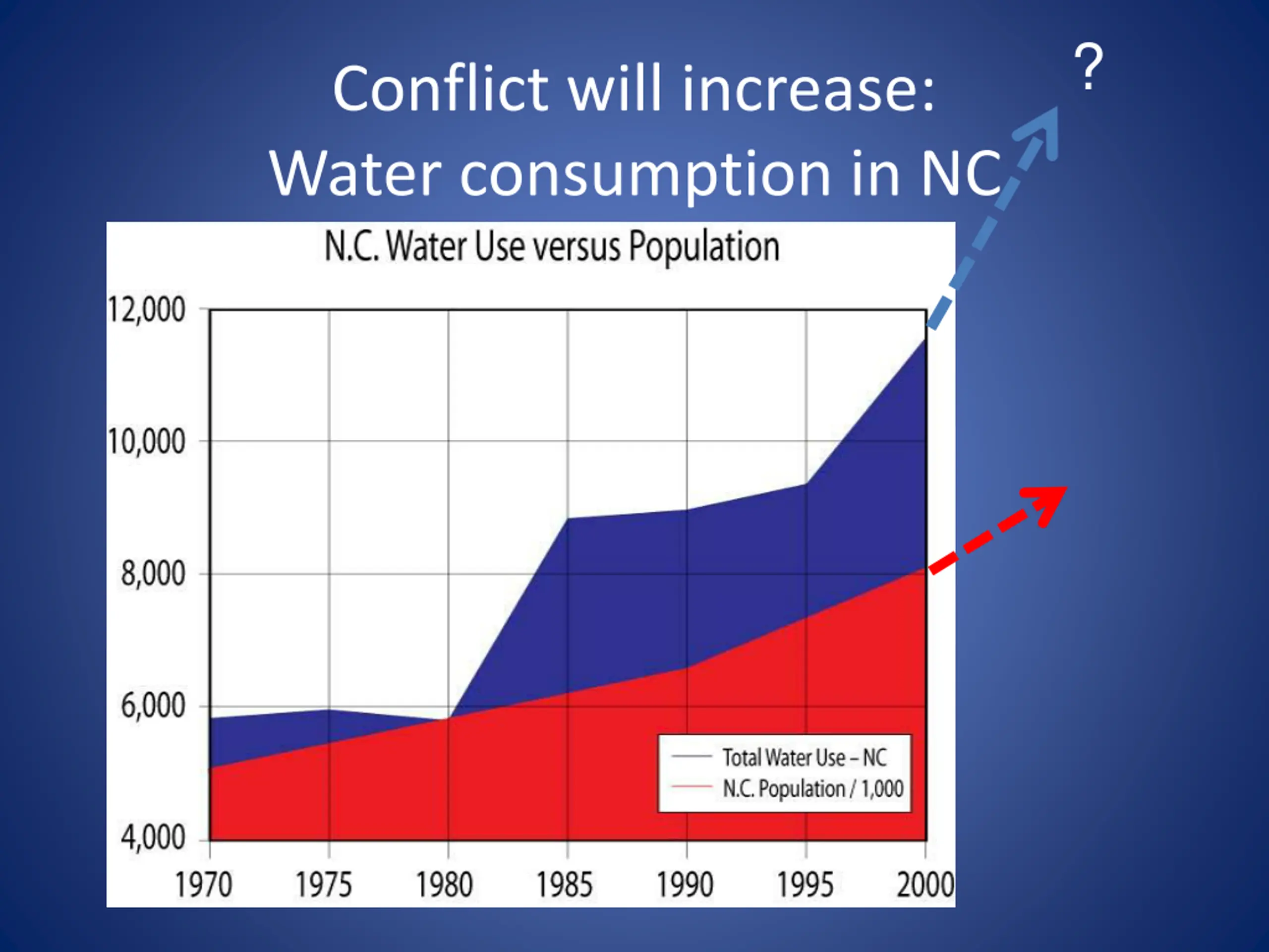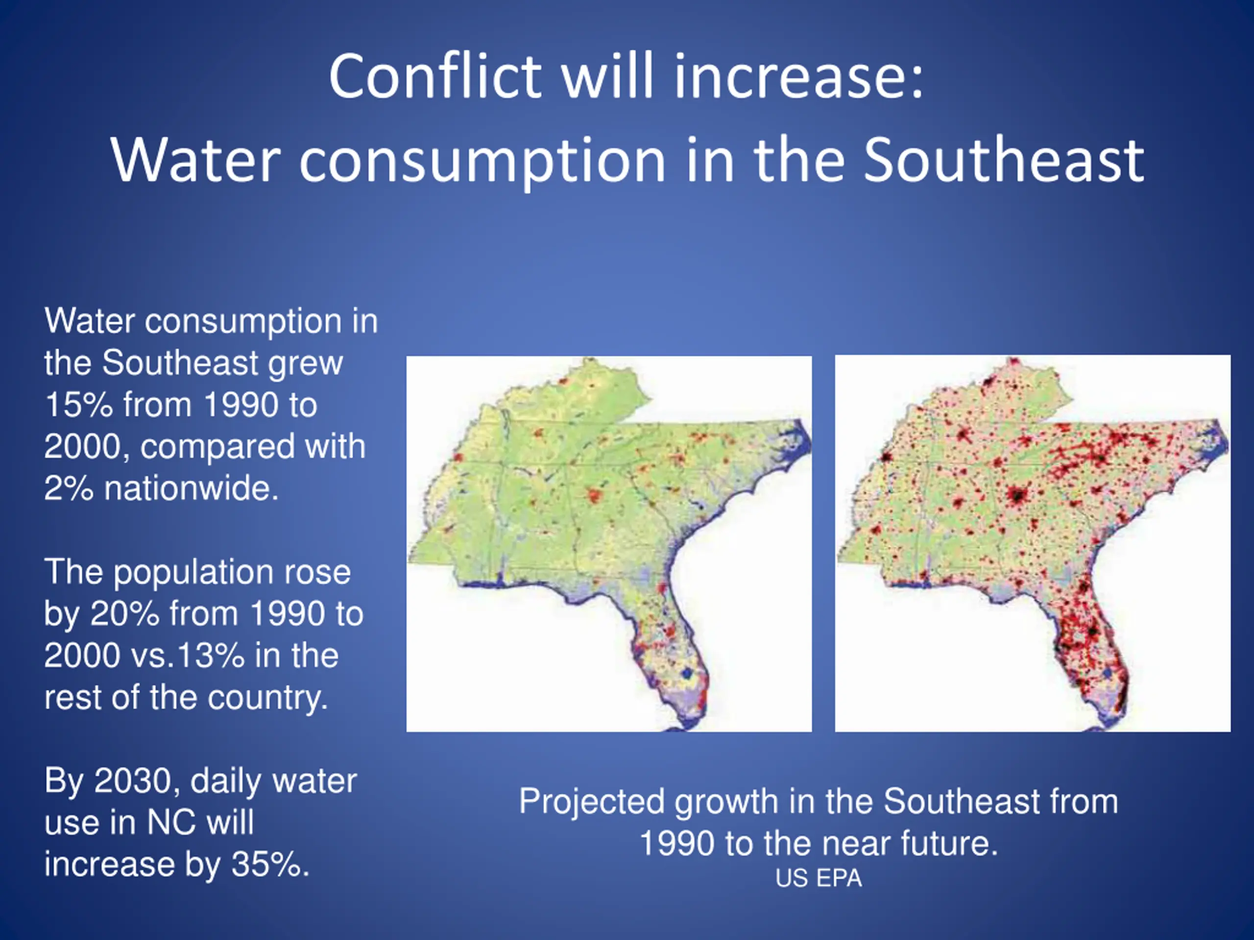 Conflict will increase: Water consumption in the Southeast Water consumption in the Southeast grew 15% from 1990 to 2000, compared with 2% nationwide. The population rose by 20% from 1990 to 2000 vs.13% in the rest of the country. By 2030, daily water use in NC will increase by 35%. Projected growth in the Southeast from 1990 to the near future. US EPA