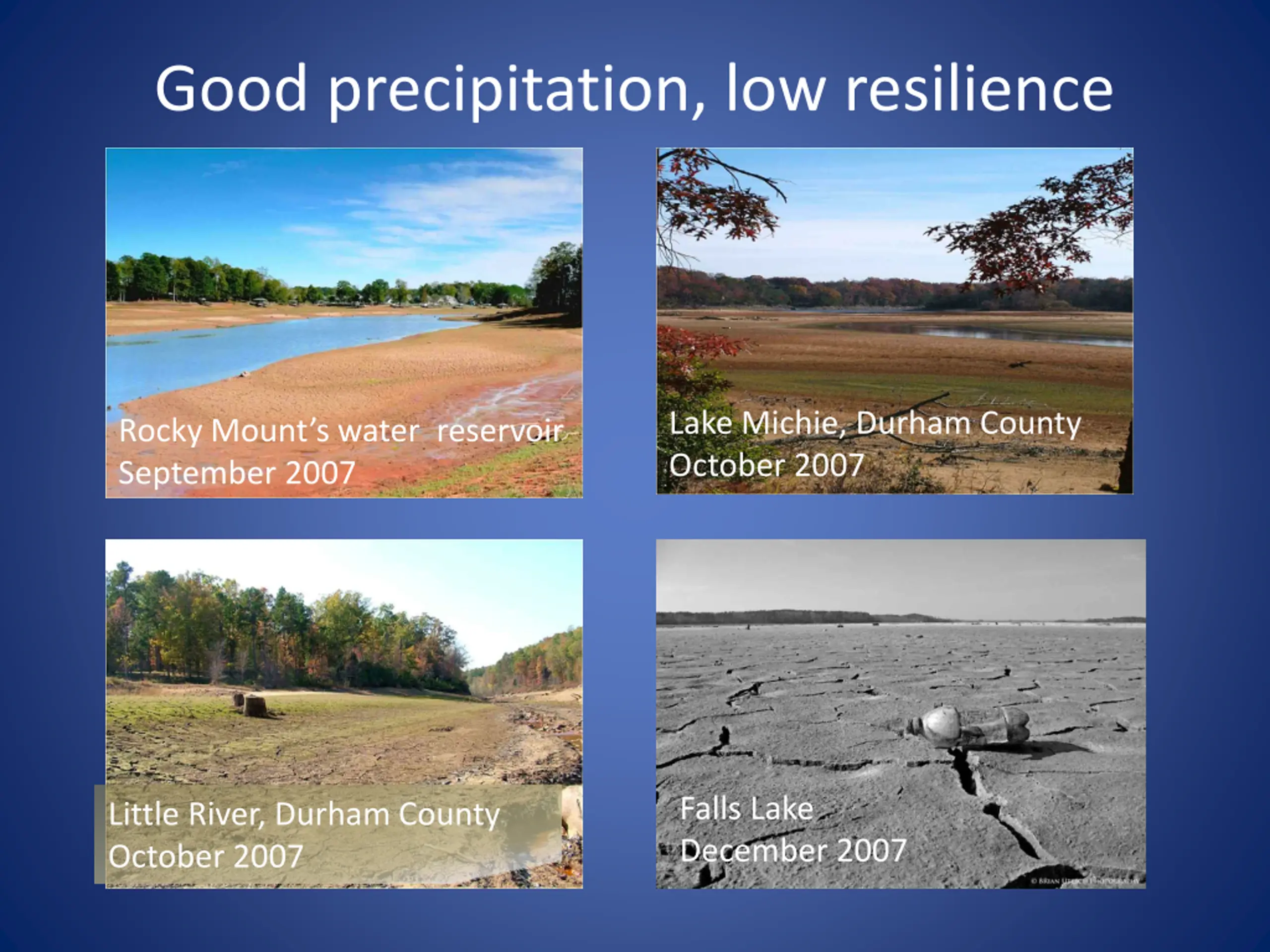 Good precipitation, low resilience Lake Michie, Durham County October 2007 Rocky Mount s water reservoir September 2007 Falls Lake December 2007 Little River, Durham County October 2007