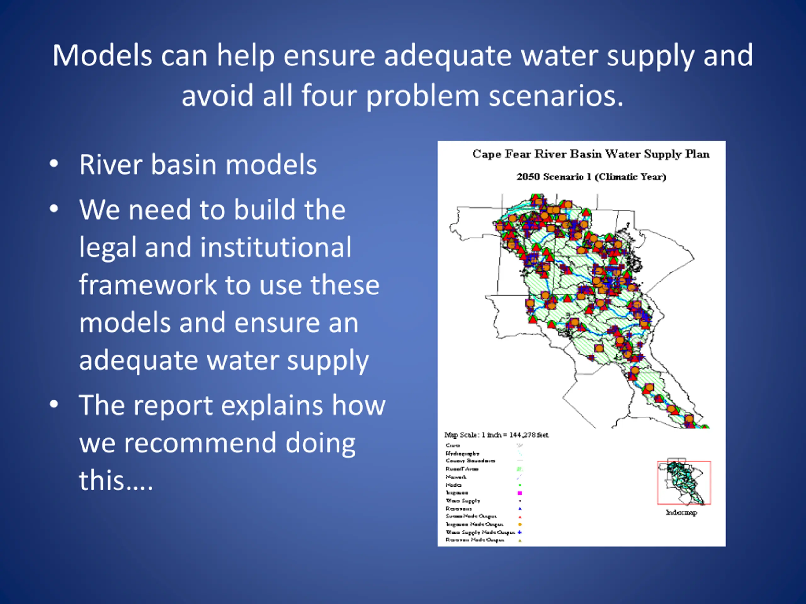 Models can help ensure adequate water supply and avoid all four problem scenarios. River basin models We need to build the legal and institutional framework to use these models and ensure an adequate water supply The report explains how we recommend doing this .