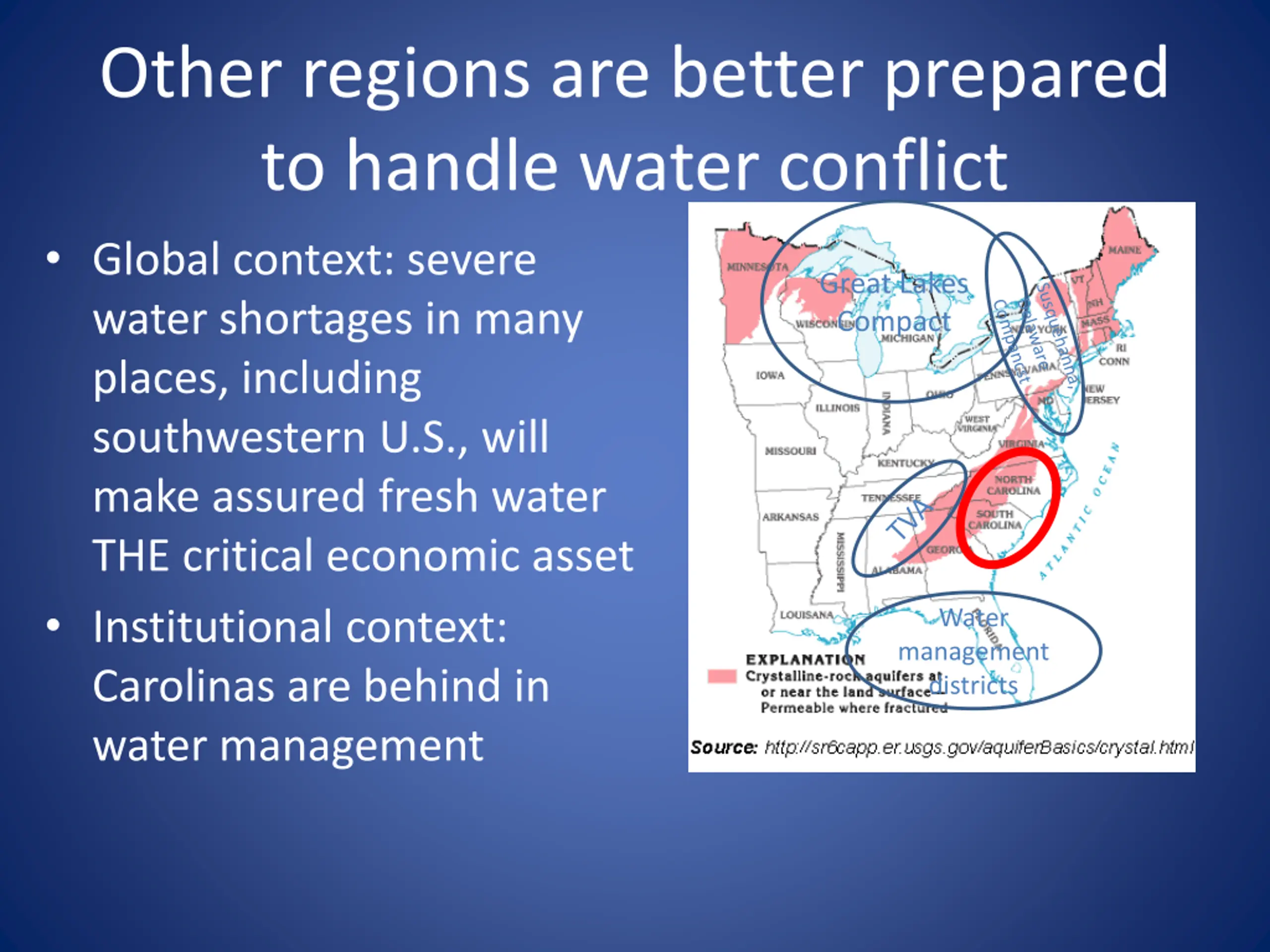 Other regions are better prepared to handle water conflict Global context: severe water shortages in many places, including southwestern U.S., will make assured fresh water THE critical economic asset Institutional context: Carolinas are behind in water management Great Lakes Compact Water management districts