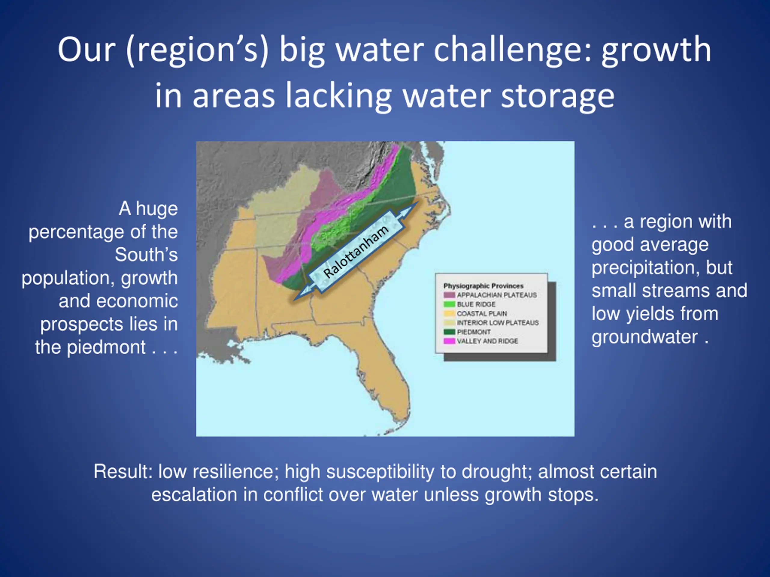 Our (regions) big water challenge: growth in areas lacking water storage A huge . . . a region with good average precipitation, but small streams and low yields from groundwater . percentage of the South s population, growth and economic prospects lies in the piedmont . . . Result: low resilience; high susceptibility to drought; almost certain escalation in conflict over water unless growth stops.