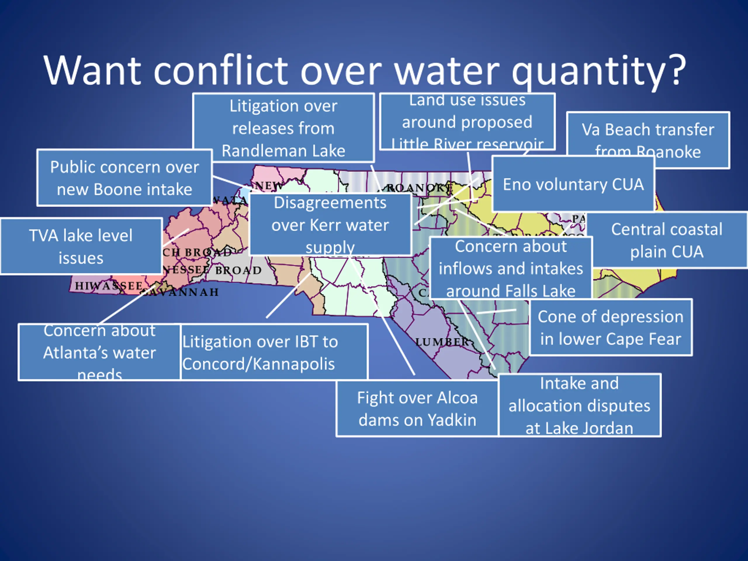 Want conflict over water quantity? Litigation over releases from Randleman Lake Public concern over new Boone intake Disagreements over Kerr water supply issues Land use issues around proposed Little River reservoir Va Beach transfer from Roanoke Eno voluntary CUA NEW ROANOKE CHOWAN WATAUGA PASQUOTANK Central coastal plain CUA TVA lake level TAR-PAMLICO Concern about inflows and intakes FRENCH BROAD LITTLE TENNESSEE HIWASSEE SAVANNAH CATAWBA YADKIN NEUSE BROAD CAPE FEAR around Falls Lake WHITE OAK Cone of depression in lower Cape Fear Concern about Atlanta s water needs Litigation over IBT to Concord/Kannapolis LUMBER Intake and allocation disputes at Lake Jordan Fight over Alcoa dams on Yadkin