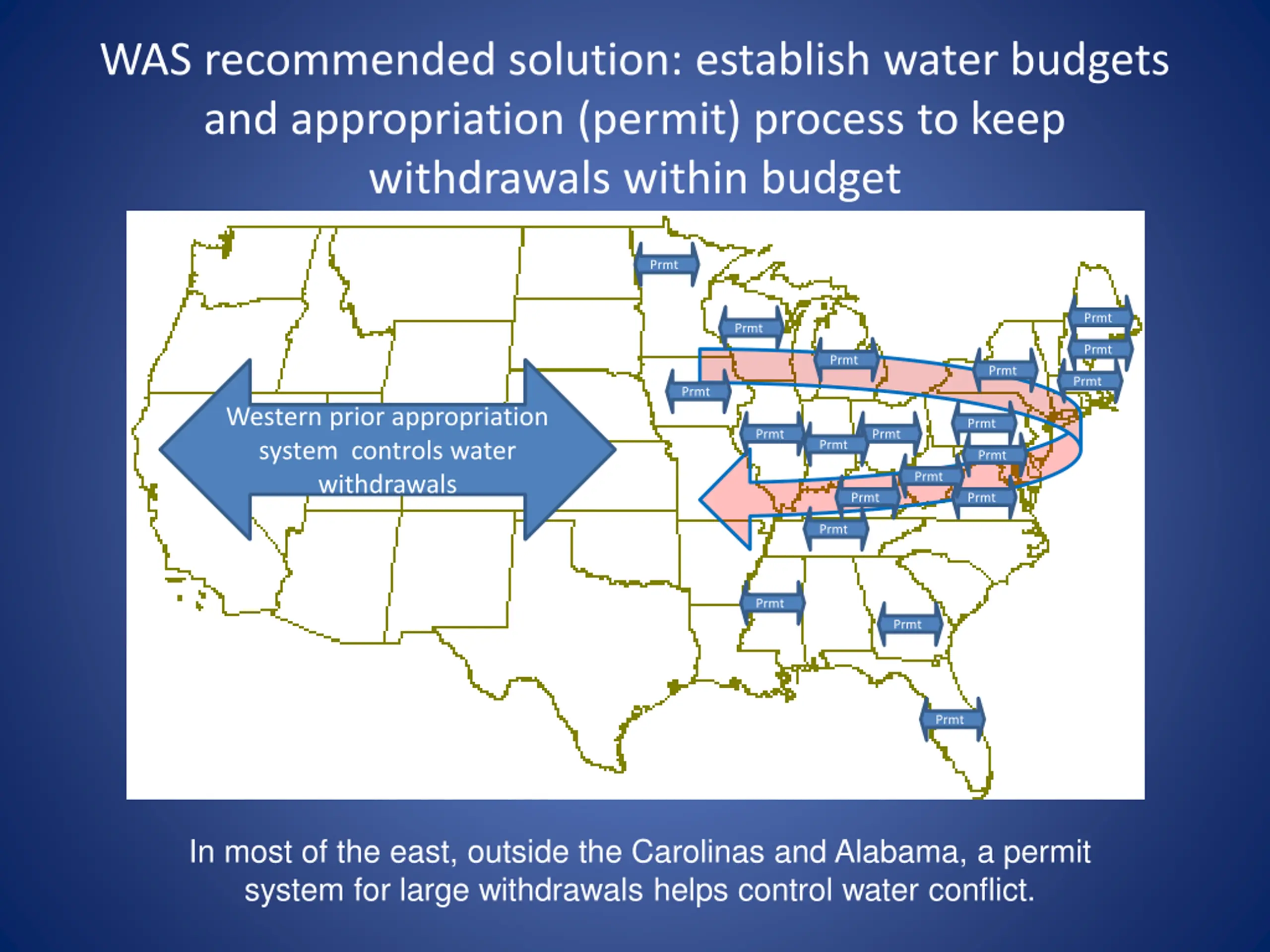 WAS recommended solution: establish water budgets and appropriation (permit) process to keep withdrawals within budget Prmt Prmt Prmt Prmt Prmt Prmt Prmt Prmt Western prior appropriation system controls water withdrawals Prmt Prmt Prmt Prmt Prmt Prmt Prmt Prmt Prmt Prmt Prmt Prmt In most of the east, outside the Carolinas and Alabama, a permit system for large withdrawals helps control water conflict.