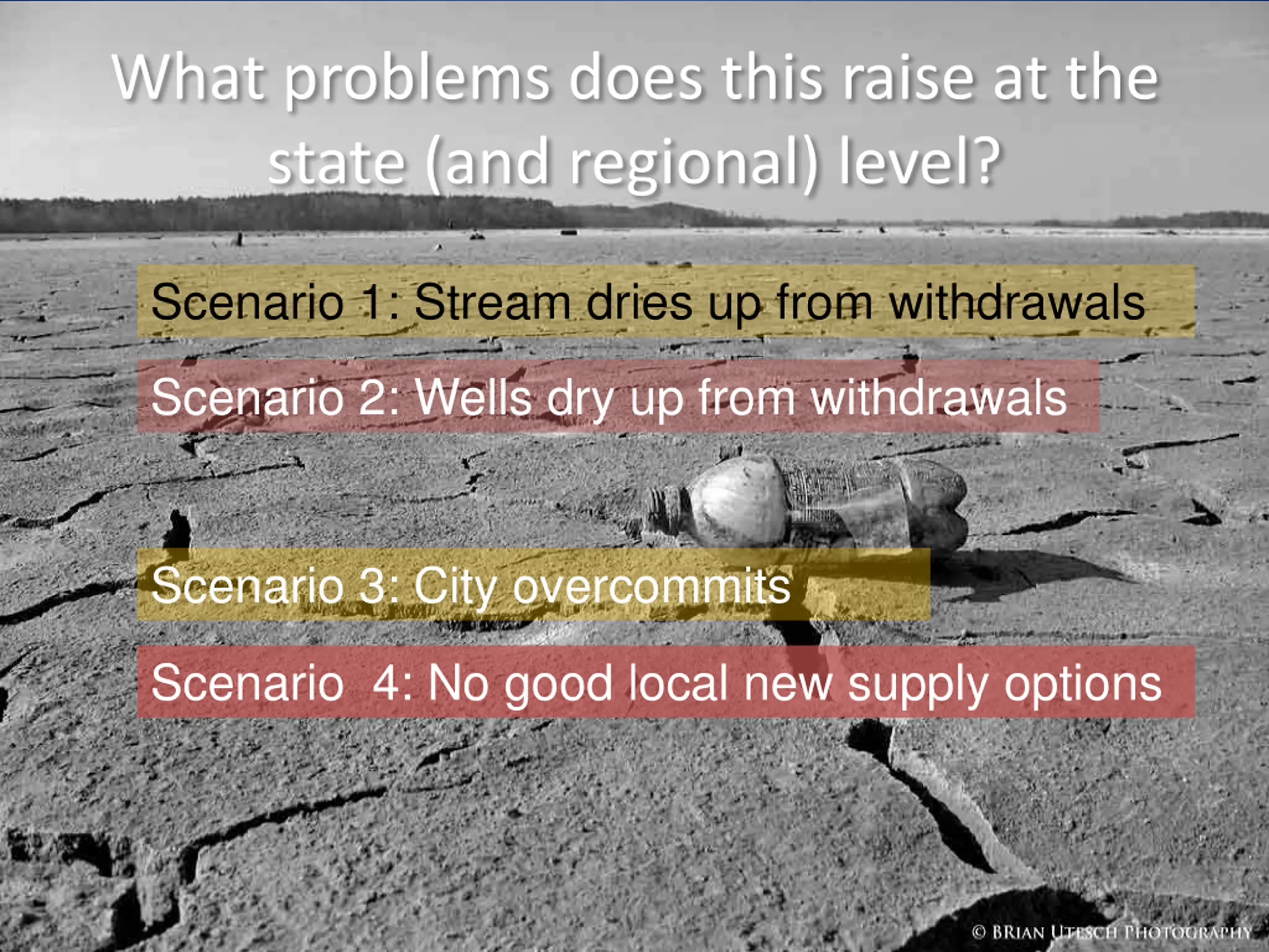 What problems does this raise at the state (and regional) level? Scenario 1: Stream dries up from withdrawals Scenario 2: Wells dry up from withdrawals Scenario 3: City overcommits Scenario 4: No good local new supply options