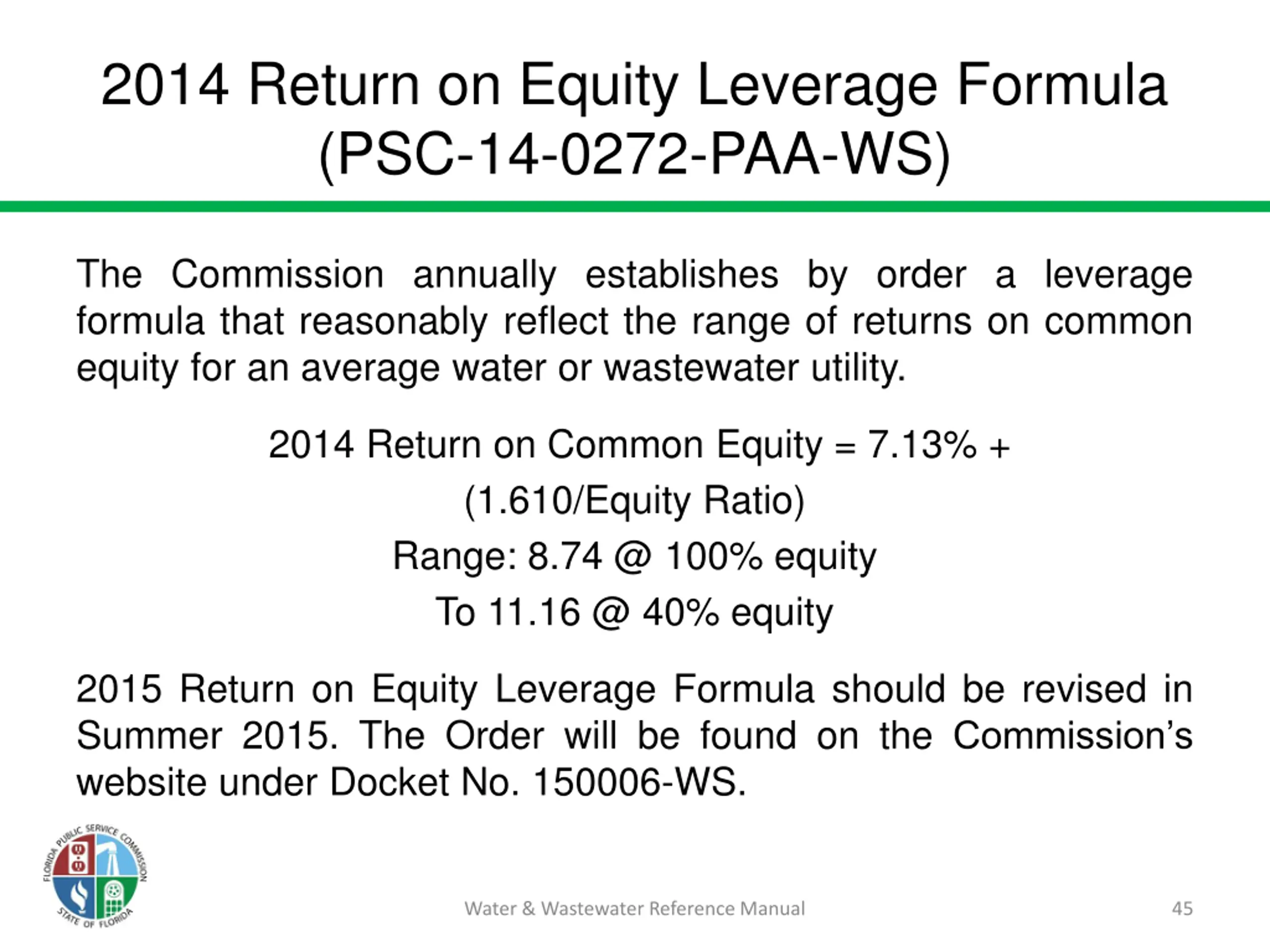 2014 Return on Equity Leverage Formula (PSC-14-0272-PAA-WS) The Commission annually establishes by order a leverage formula that reasonably reflect the range of returns on common equity for an average water or wastewater utility. 2014 Return on Common Equity = 7.13% + (1.610/Equity Ratio) Range: 8.74 @ 100% equity To 11.16 @ 40% equity 2015 Return on Equity Leverage Formula should be revised in Summer 2015. The Order will be found on the Commission s website under Docket No. 150006-WS. Water & Wastewater Reference Manual 45