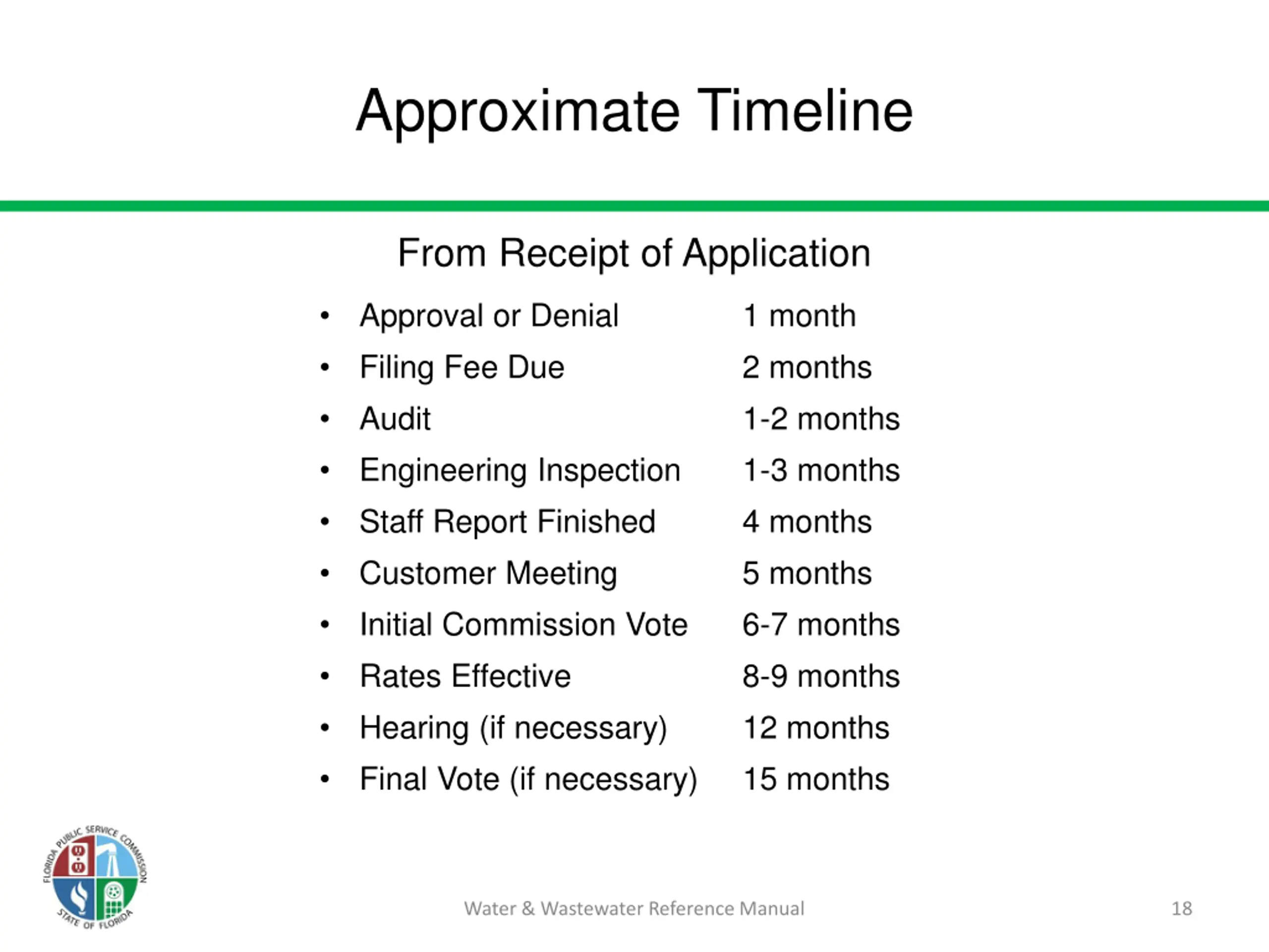 Approximate Timeline From Receipt of Application Approval or Denial Filing Fee Due Audit Engineering Inspection Staff Report Finished Customer Meeting Initial Commission Vote Rates Effective Hearing (if necessary) Final Vote (if necessary) 1 month 2 months 1-2 months 1-3 months 4 months 5 months 6-7 months 8-9 months 12 months 15 months Water & Wastewater Reference Manual 18