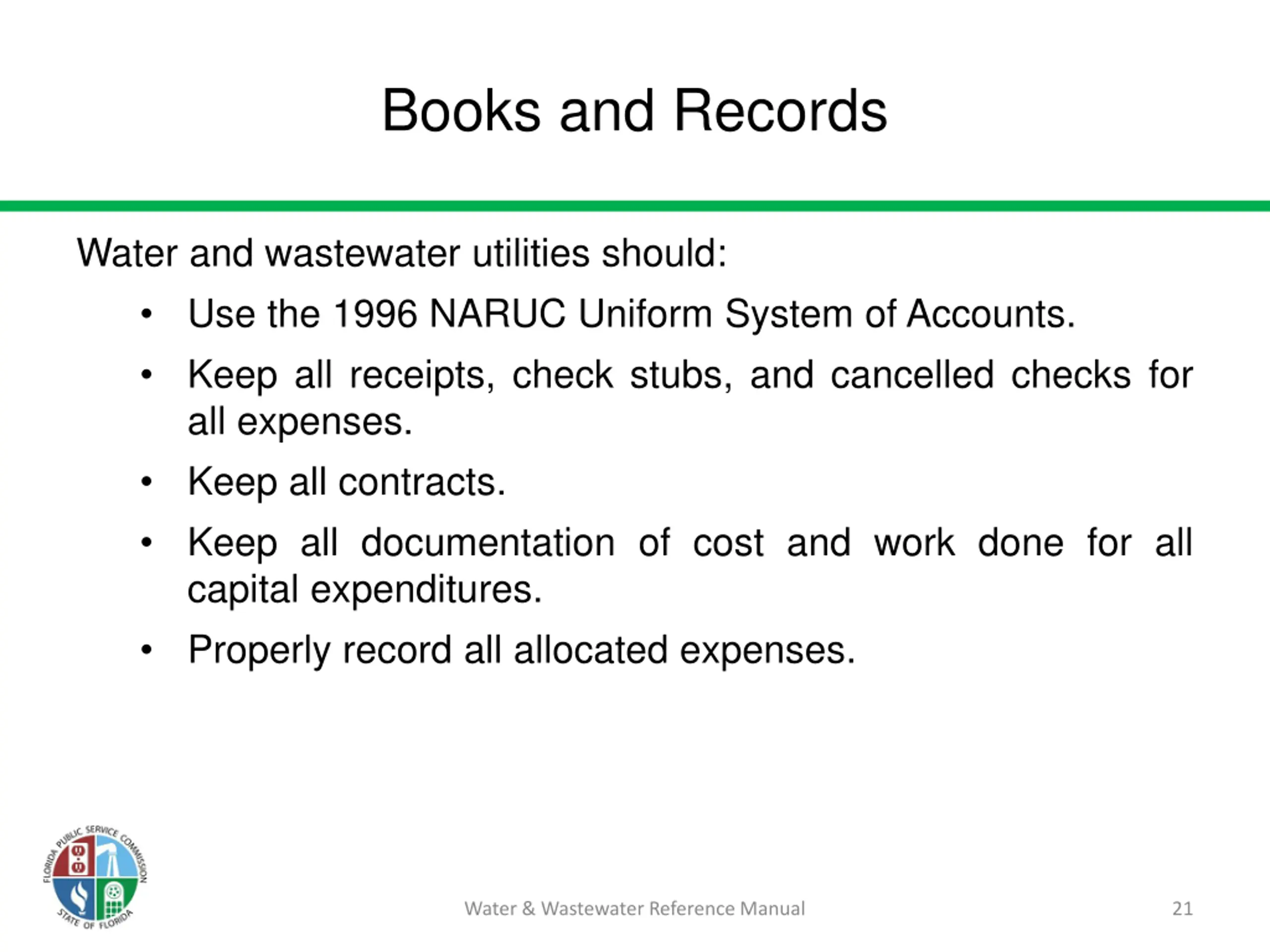 Books and Records Water and wastewater utilities should: Use the 1996 NARUC Uniform System of Accounts. Keep all receipts, check stubs, and cancelled checks for all expenses. Keep all contracts. Keep all documentation of cost and work done for all capital expenditures. Properly record all allocated expenses. Water & Wastewater Reference Manual 21