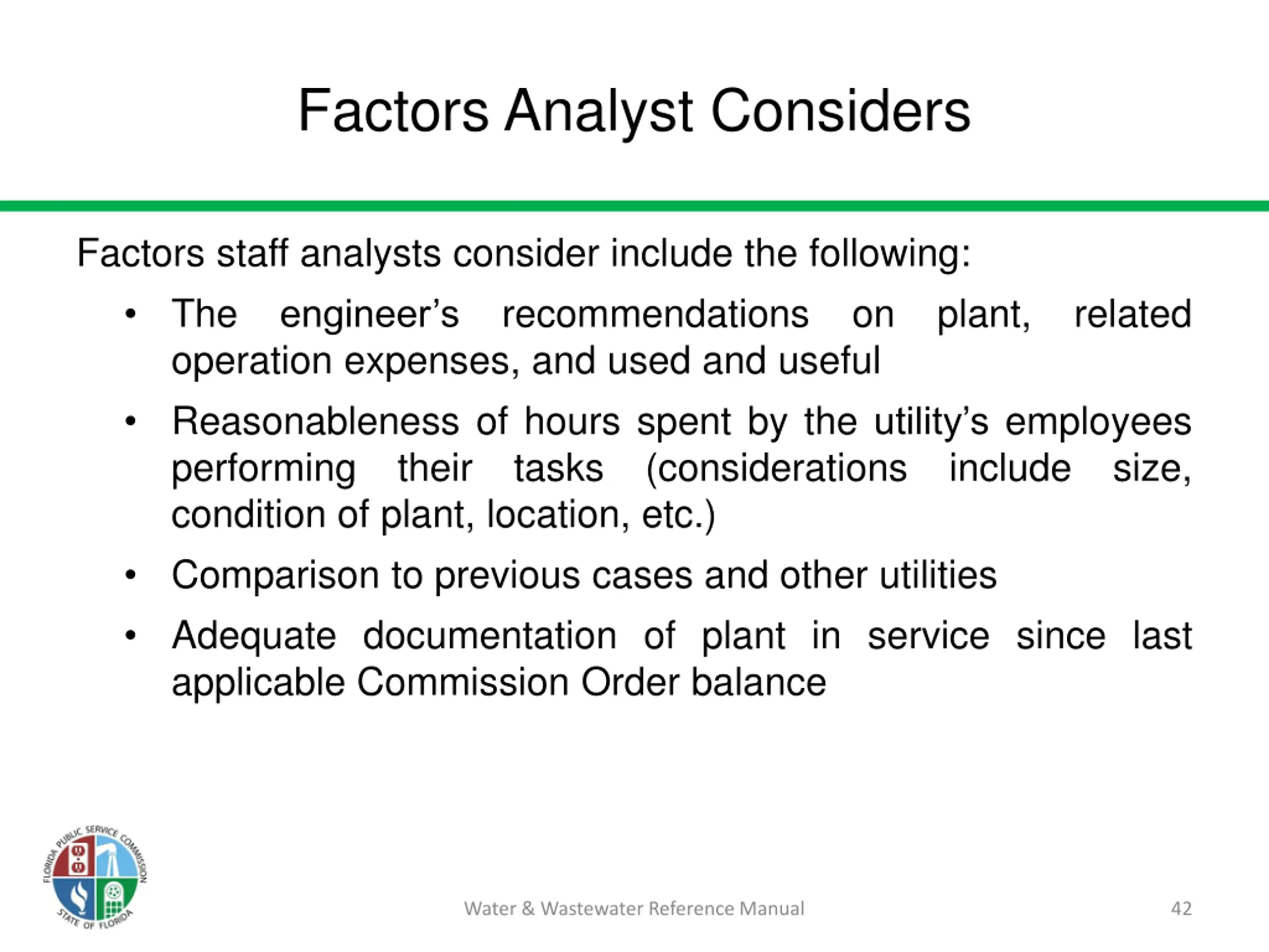 Factors Analyst Considers Factors staff analysts consider include the following: The engineer s recommendations on plant, related operation expenses, and used and useful Reasonableness of hours spent by the utility s employees performing their tasks (considerations include size, condition of plant, location, etc.) Comparison to previous cases and other utilities Adequate documentation of plant in service since last applicable Commission Order balance Water & Wastewater Reference Manual 42