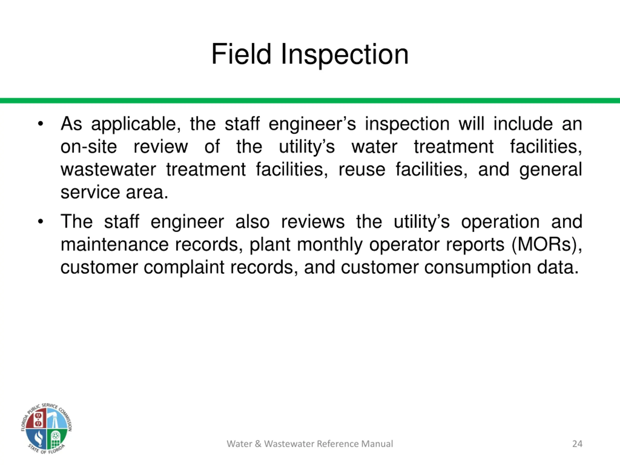 Field Inspection As applicable, the staff engineer s inspection will include an on-site review of the utility s water treatment facilities, wastewater treatment facilities, reuse facilities, and general service area. The staff engineer also reviews the utility s operation and maintenance records, plant monthly operator reports (MORs), customer complaint records, and customer consumption data. Water & Wastewater Reference Manual 24