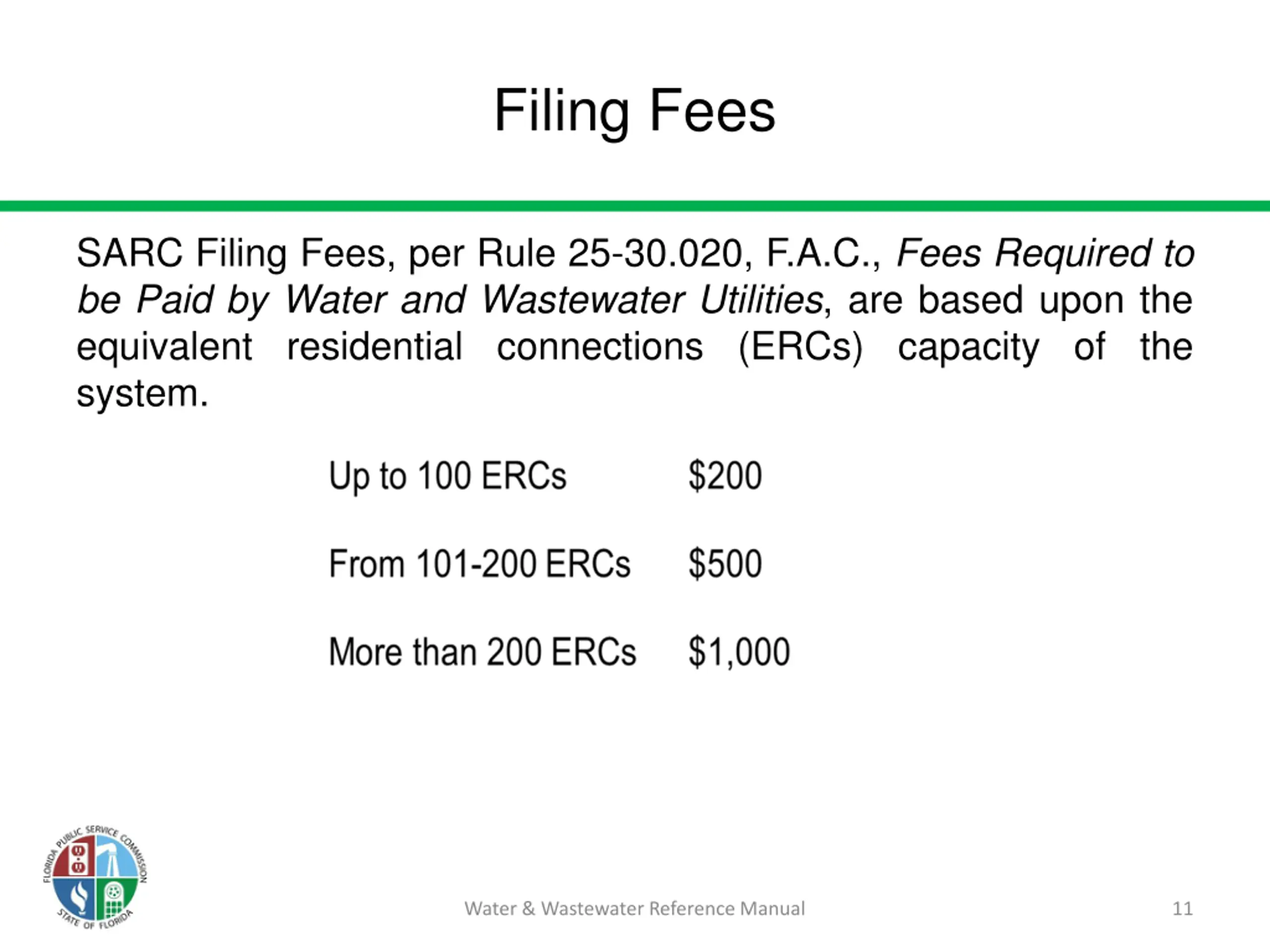 Filing Fees SARC Filing Fees, per Rule 25-30.020, F.A.C., Fees Required to be Paid by Water and Wastewater Utilities, are based upon the equivalent residential connections (ERCs) capacity of the system. Water & Wastewater Reference Manual 11