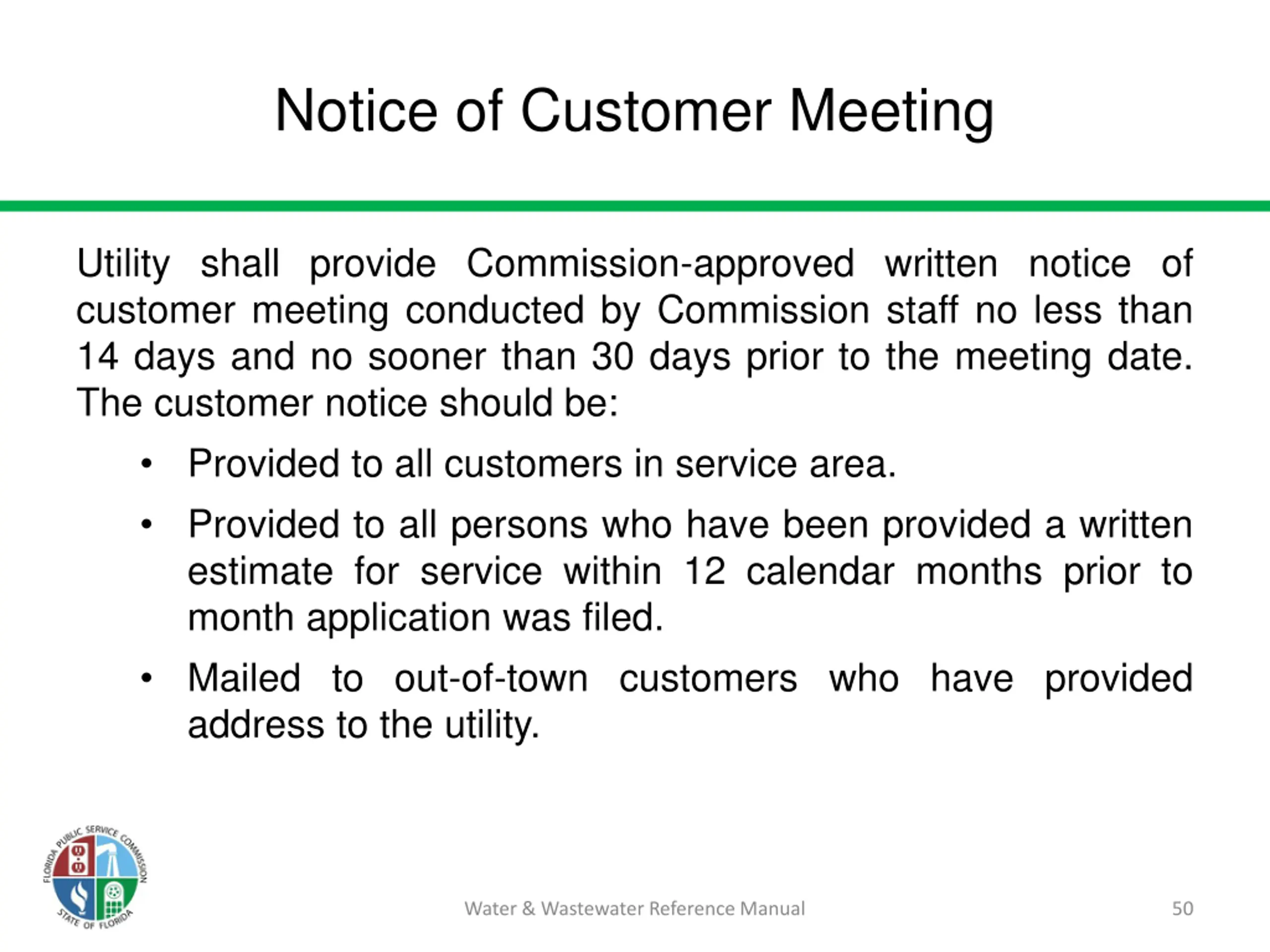 Notice of Customer Meeting Utility shall provide Commission-approved written notice of customer meeting conducted by Commission staff no less than 14 days and no sooner than 30 days prior to the meeting date. The customer notice should be: Provided to all customers in service area. Provided to all persons who have been provided a written estimate for service within 12 calendar months prior to month application was filed. Mailed to out-of-town customers who have provided address to the utility. Water & Wastewater Reference Manual 50