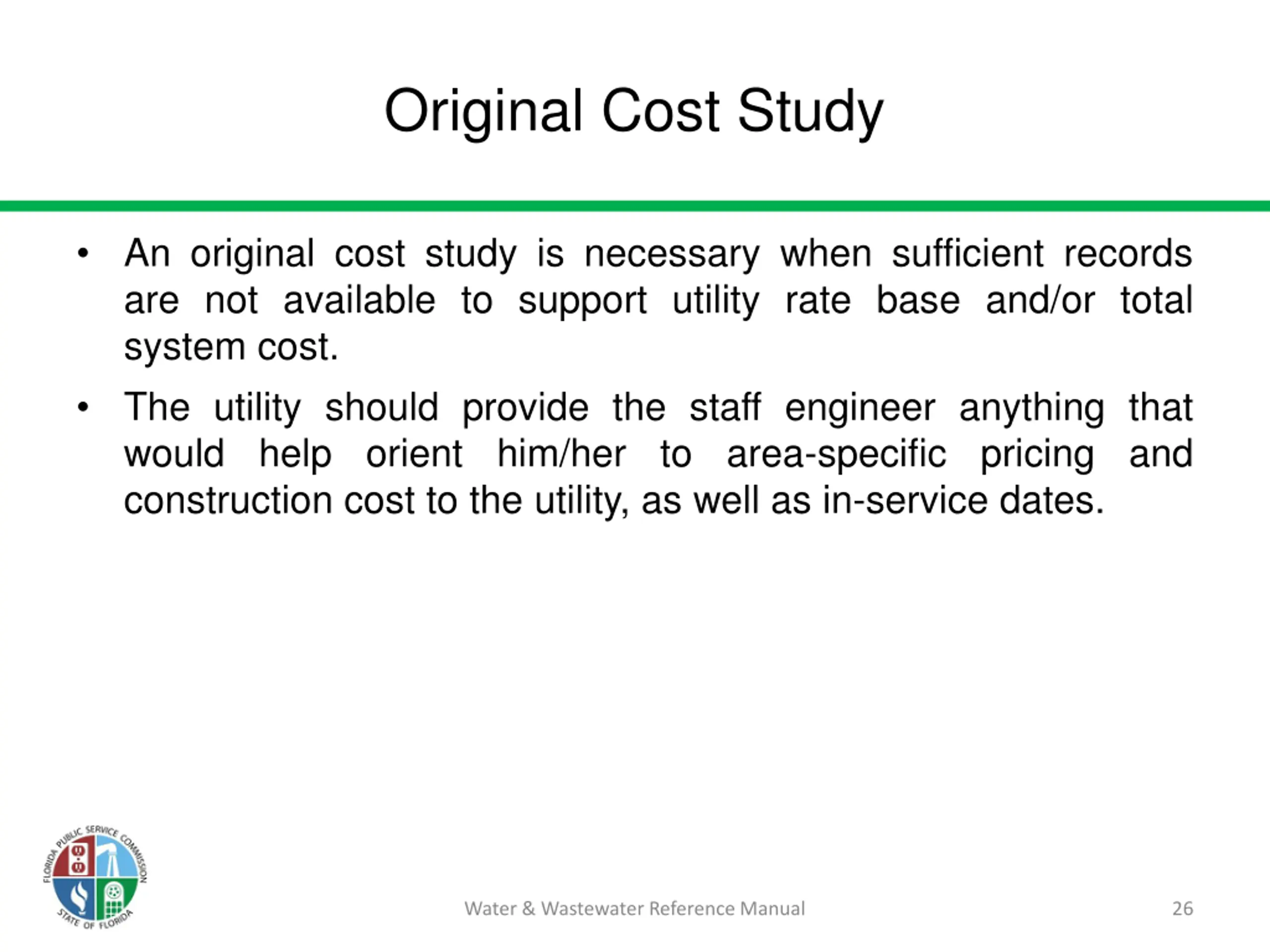 Original Cost Study An original cost study is necessary when sufficient records are not available to support utility rate base and/or total system cost. The utility should provide the staff engineer anything that would help orient him/her to area-specific pricing and construction cost to the utility, as well as in-service dates. Water & Wastewater Reference Manual 26