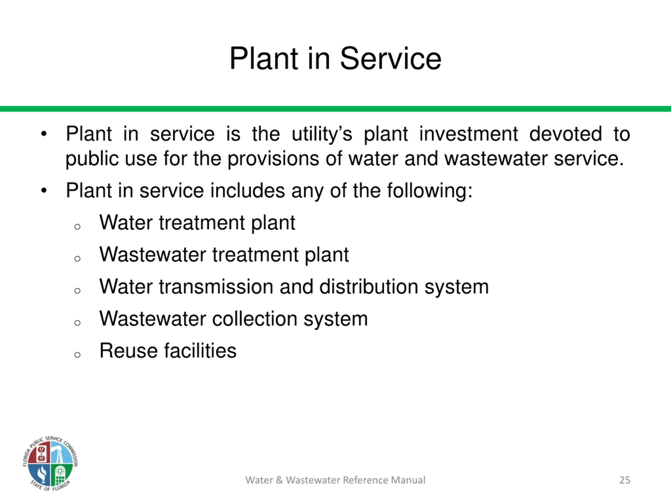 Plant in Service Plant in service is the utility s plant investment devoted to public use for the provisions of water and wastewater service. Plant in service includes any of the following: o Water treatment plant o Wastewater treatment plant o Water transmission and distribution system o Wastewater collection system o Reuse facilities Water & Wastewater Reference Manual 25