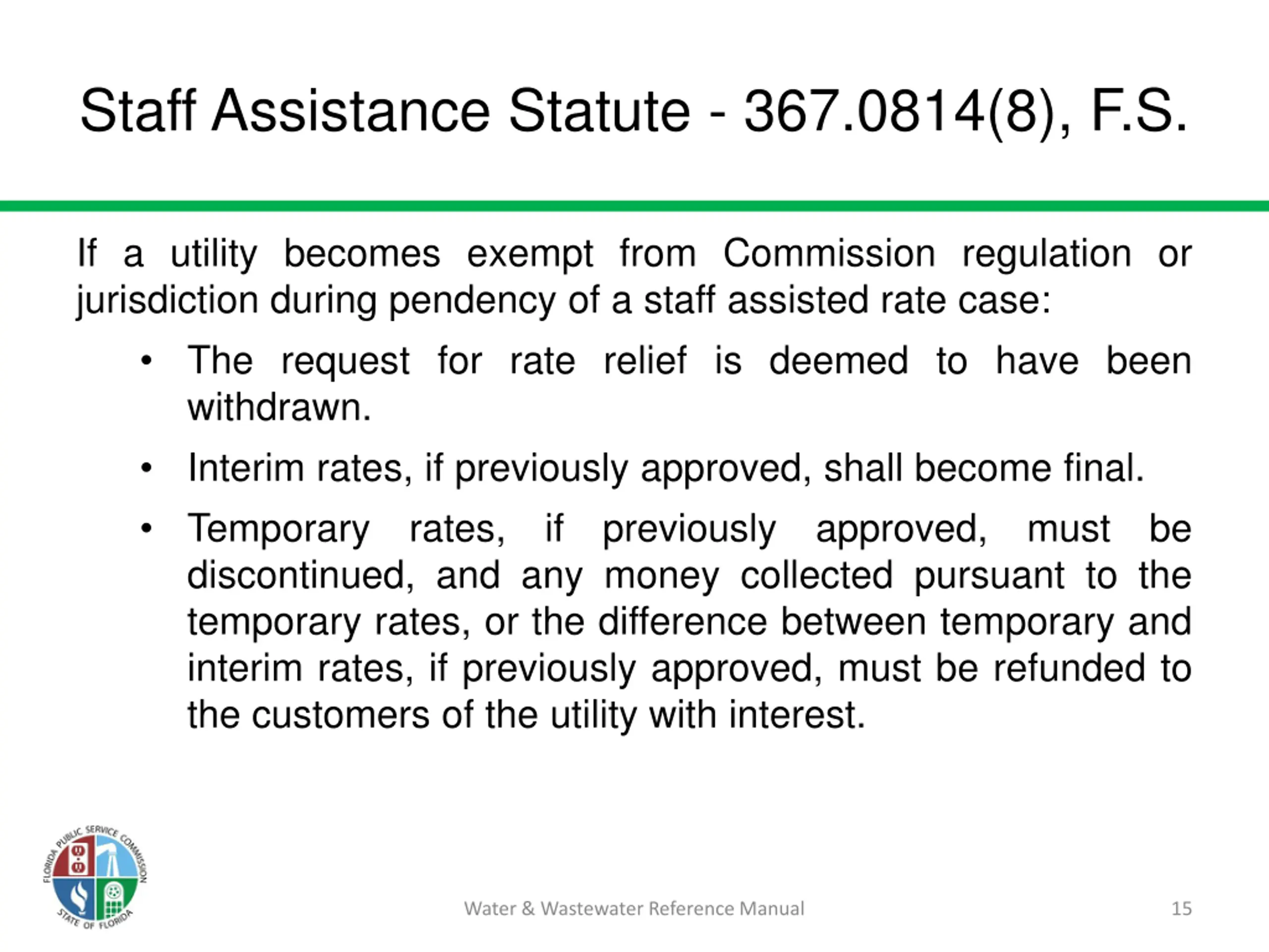 Staff Assistance Statute - 367.0814(8), F.S. If a utility becomes exempt from Commission regulation or jurisdiction during pendency of a staff assisted rate case: The request for rate relief is deemed to have been withdrawn. Interim rates, if previously approved, shall become final. Temporary rates, if previously approved, must be discontinued, and any money collected pursuant to the temporary rates, or the difference between temporary and interim rates, if previously approved, must be refunded to the customers of the utility with interest. Water & Wastewater Reference Manual 15