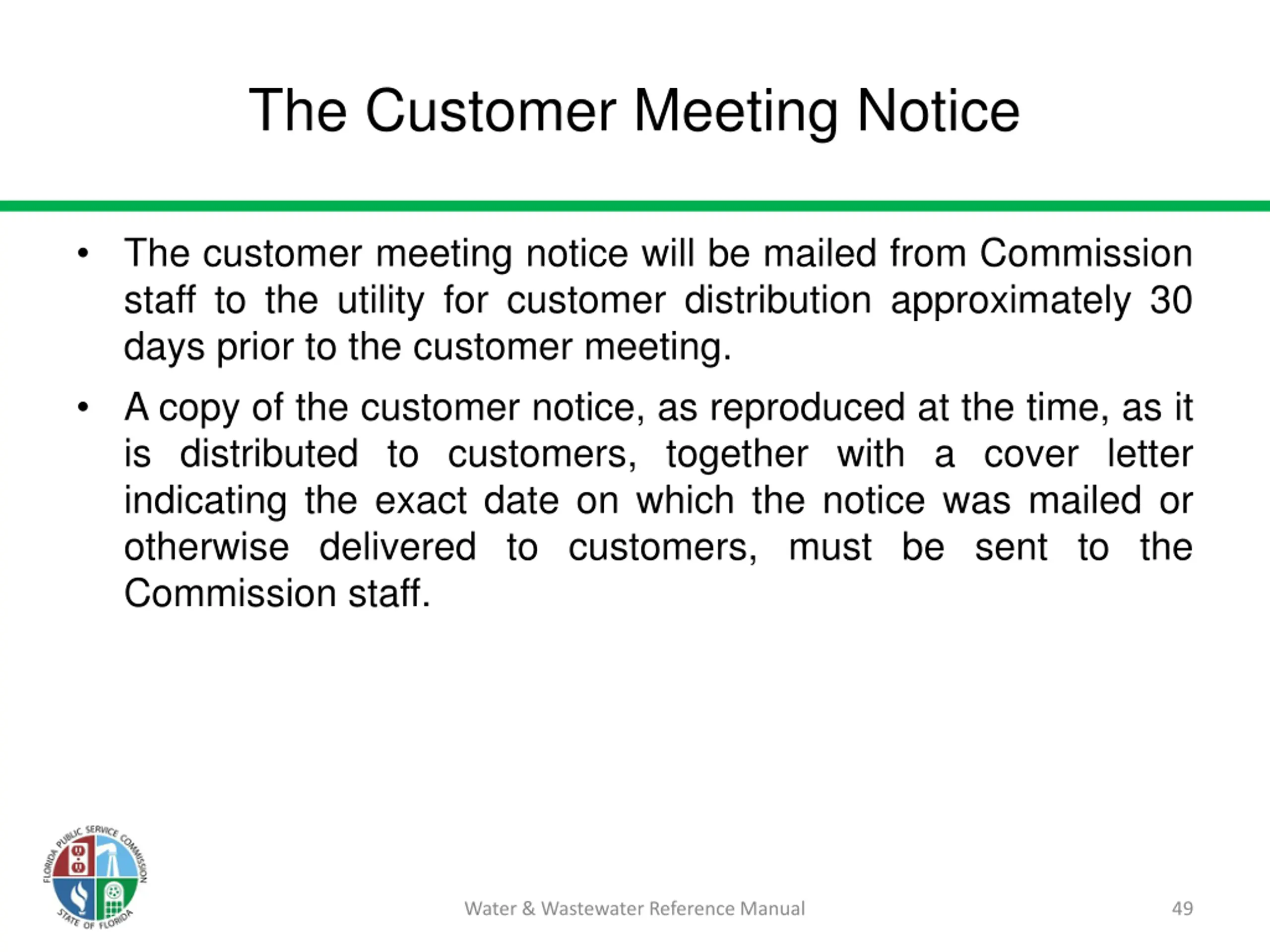 The Customer Meeting Notice The customer meeting notice will be mailed from Commission staff to the utility for customer distribution approximately 30 days prior to the customer meeting. A copy of the customer notice, as reproduced at the time, as it is distributed to customers, together with a cover letter indicating the exact date on which the notice was mailed or otherwise delivered to customers, must be sent to the Commission staff. Water & Wastewater Reference Manual 49