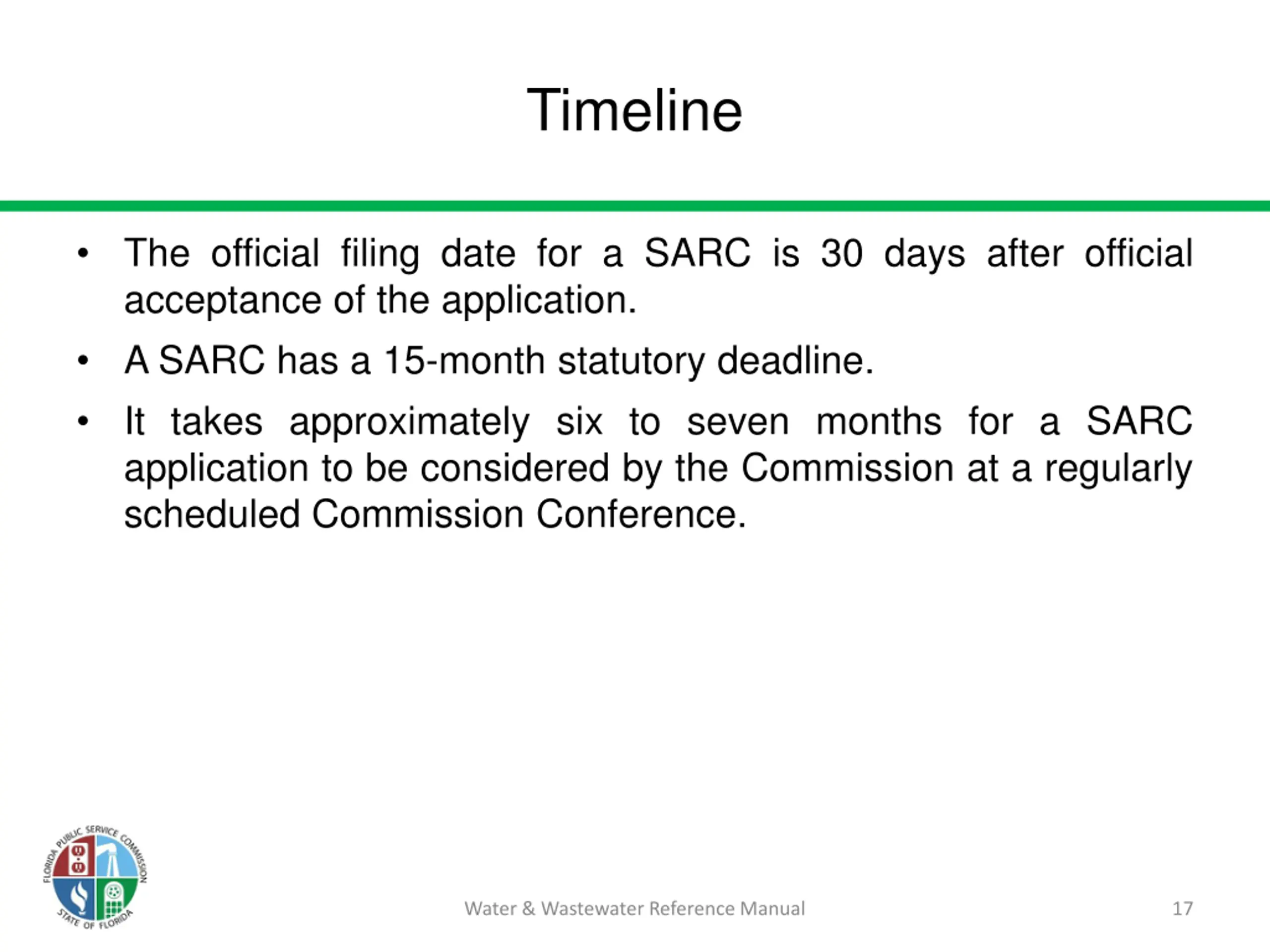 Timeline The official filing date for a SARC is 30 days after official acceptance of the application. A SARC has a 15-month statutory deadline. It takes approximately six to seven months for a SARC application to be considered by the Commission at a regularly scheduled Commission Conference. Water & Wastewater Reference Manual 17