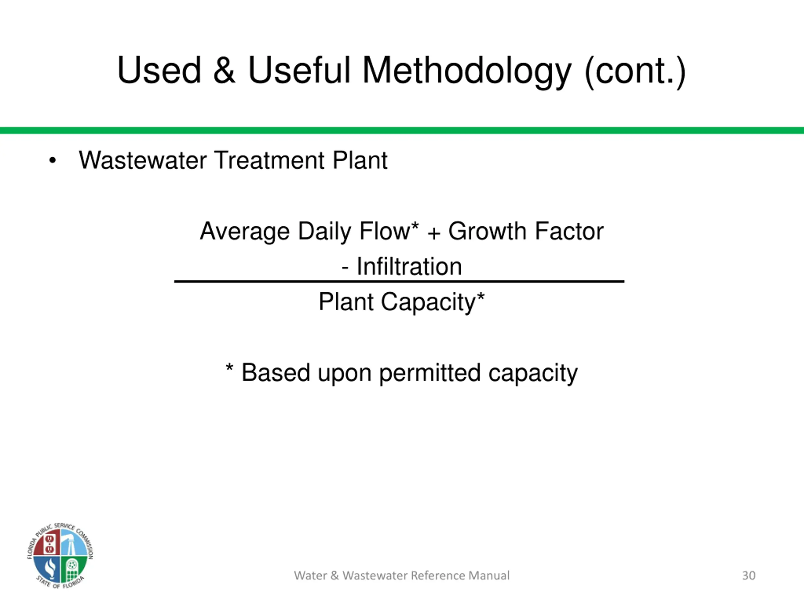 Used & Useful Methodology Water Treatment Plant Max Flow + Fire Flow + Growth Factor Unaccounted for Water Plant Capacity Water & Wastewater Reference Manual 29