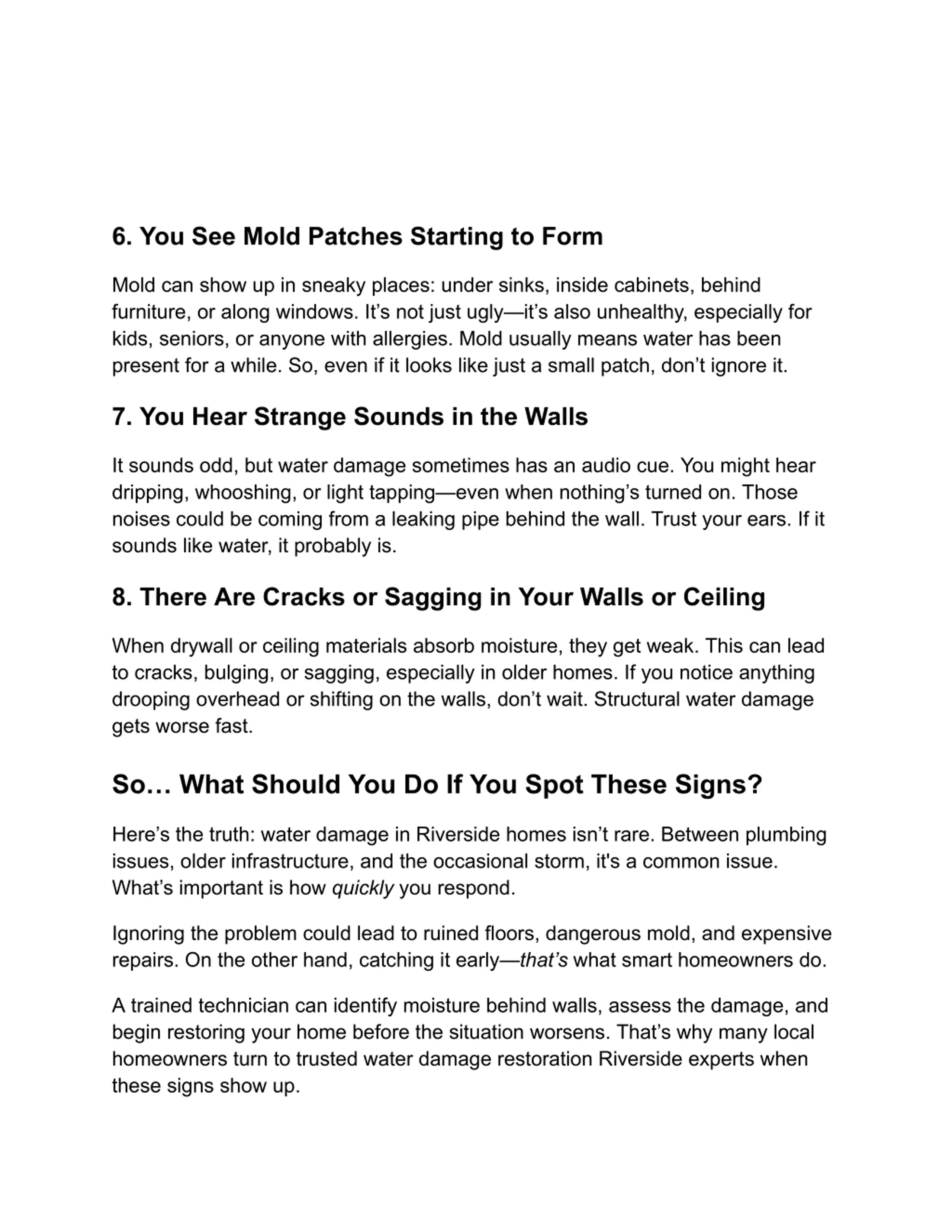 6. You See Mold Patches Starting to Form Mold can show up in sneaky places: under sinks, inside cabinets, behind furniture, or along windows. It s not just ugly it s also unhealthy, especially for kids, seniors, or anyone with allergies. Mold usually means water has been present for a while. So, even if it looks like just a small patch, don t ignore it. 7. You Hear Strange Sounds in the Walls It sounds odd, but water damage sometimes has an audio cue. You might hear dripping, whooshing, or light tapping even when nothing s turned on. Those noises could be coming from a leaking pipe behind the wall. Trust your ears. If it sounds like water, it probably is. 8. There Are Cracks or Sagging in Your Walls or Ceiling When drywall or ceiling materials absorb moisture, they get weak. This can lead to cracks, bulging, or sagging, especially in older homes. If you notice anything drooping overhead or shifting on the walls, don t wait. Structural water damage gets worse fast. So What Should You Do If You Spot These Signs? Here s the truth: water damage in Riverside homes isn t rare. Between plumbing issues, older infrastructure, and the occasional storm, it's a common issue. What s important is how quickly you respond. Ignoring the problem could lead to ruined floors, dangerous mold, and expensive repairs. On the other hand, catching it early that s what smart homeowners do. A trained technician can identify moisture behind walls, assess the damage, and begin restoring your home before the situation worsens. That s why many local homeowners turn to trusted water damage restoration Riverside experts when these signs show up.