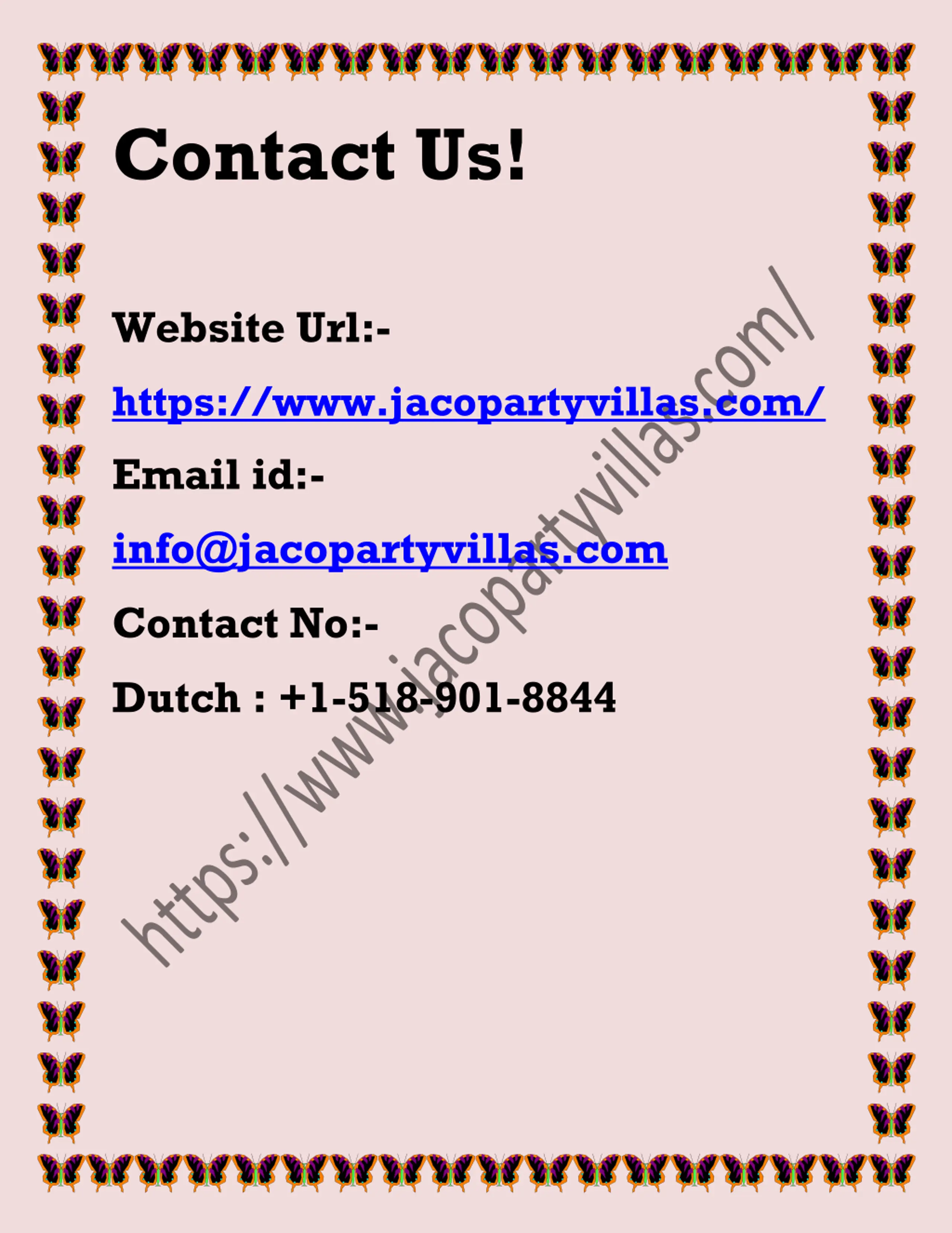 Contact Us! Website Url:- https://www.jacopartyvillas.com/ Email id:- info@jacopartyvillas.com Contact No:- Dutch : +1-518-901-8844