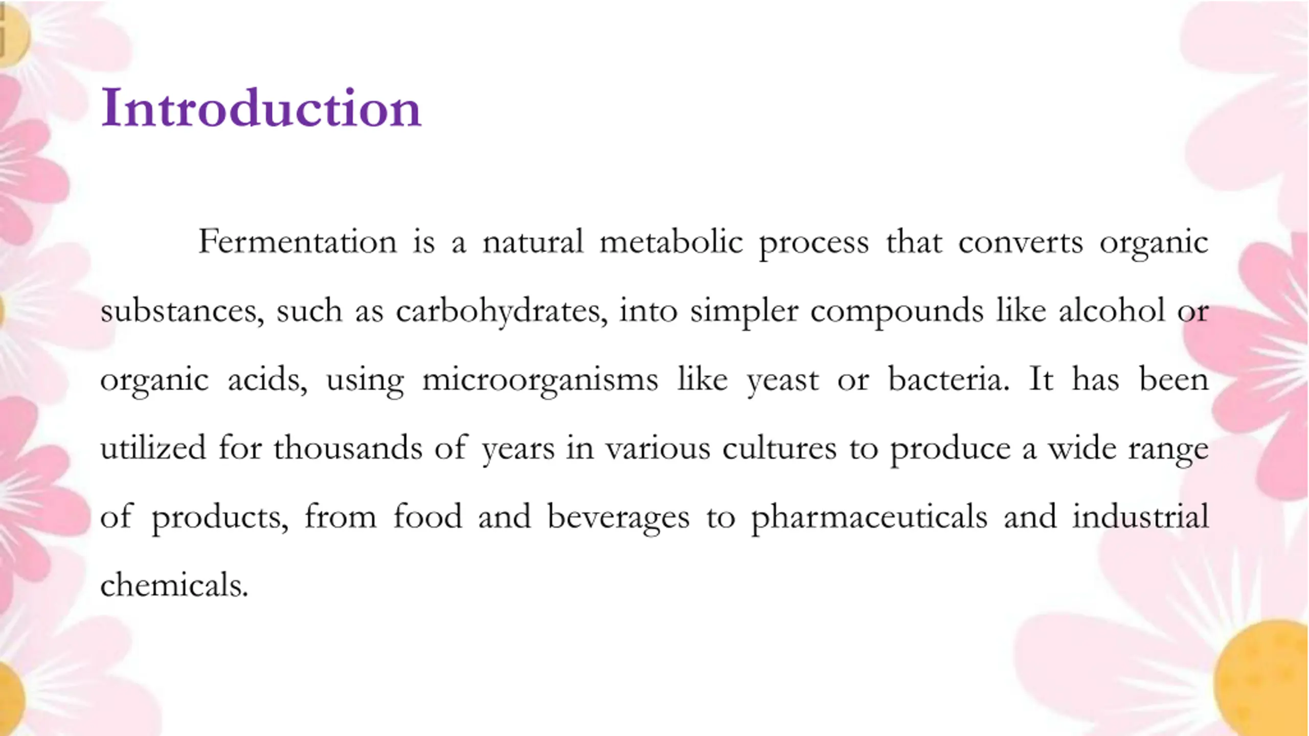 Introduction Fermentation is a natural metabolic process that converts organic substances, such as carbohydrates, into simpler compounds like alcohol or organic acids, using microorganisms like yeast or bacteria. It has been utilized for thousands of years in various cultures to produce a wide range of products, from food and beverages to pharmaceuticals and industrial chemicals.