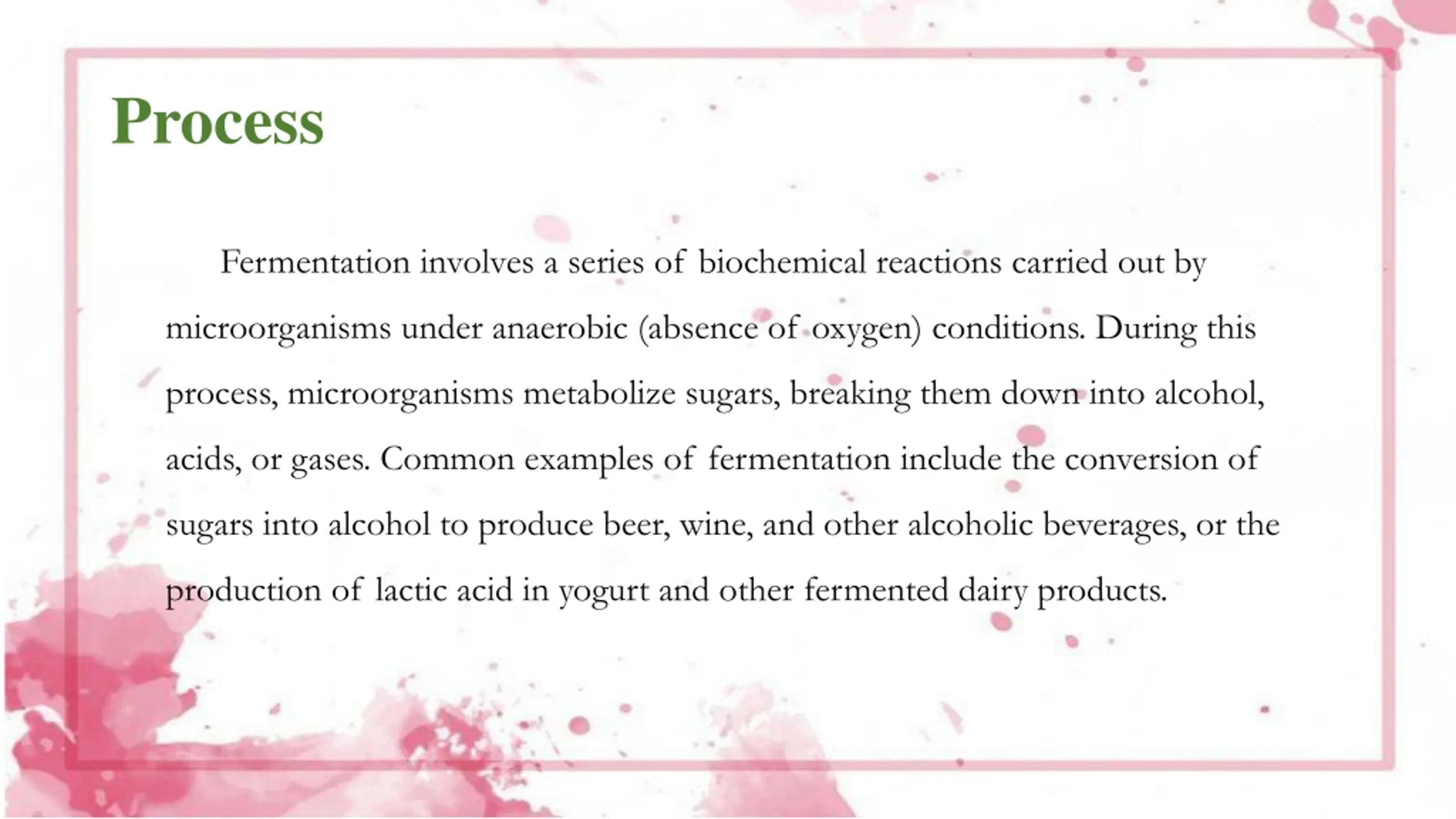 Process Fermentation involves a series of biochemical reactions carried out by microorganisms under anaerobic (absence of oxygen) conditions. During this process, microorganisms metabolize sugars, breaking them down into alcohol, acids, or gases. Common examples of fermentation include the conversion of sugars into alcohol to produce beer, wine, and other alcoholic beverages, or the production of lactic acid in yogurt and other fermented dairy products.