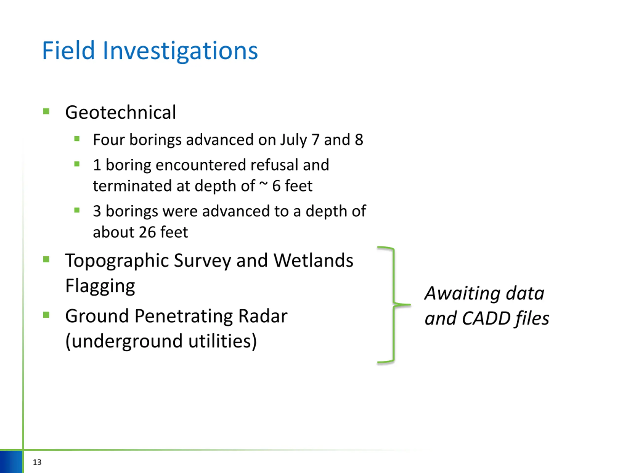 Field Investigations Geotechnical Four borings advanced on July 7 and 8 1 boring encountered refusal and terminated at depth of ~ 6 feet 3 borings were advanced to a depth of about 26 feet Topographic Survey and Wetlands Flagging Ground Penetrating Radar (underground utilities) Awaiting data and CADD files 13