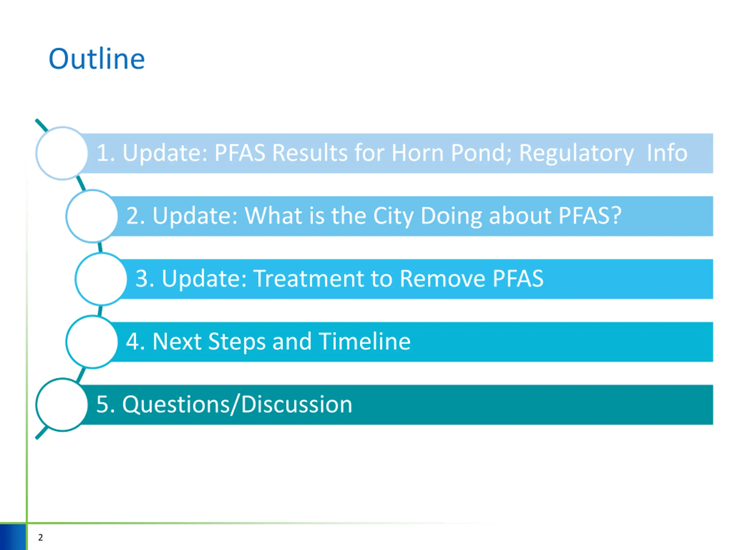 Outline 1. Update: PFAS Results for Horn Pond; Regulatory Info 2. Update: What is the City Doing about PFAS? 3. Update: Treatment to Remove PFAS 4. Next Steps and Timeline 5. Questions/Discussion 2