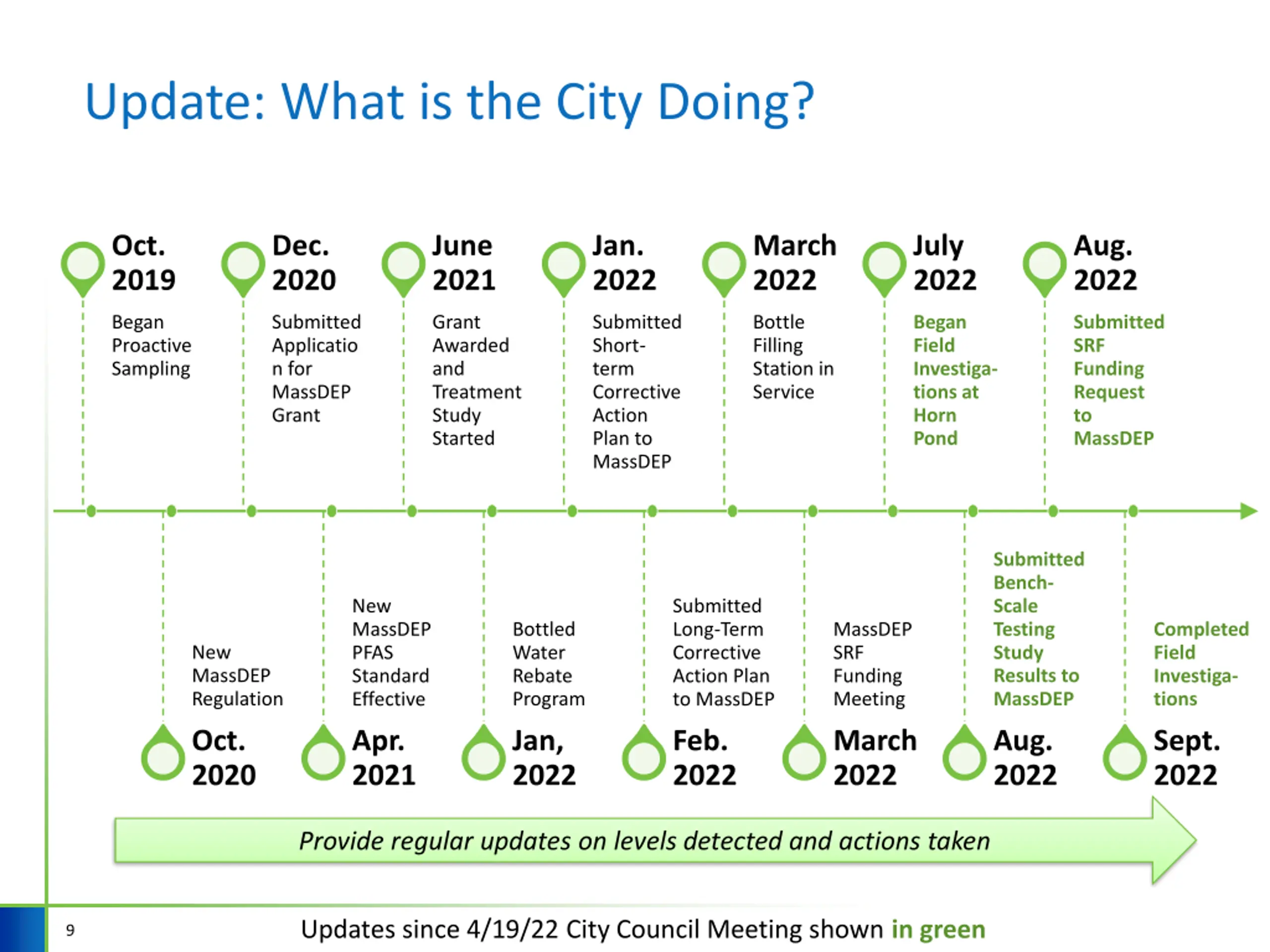 Update: What is the City Doing? Oct. 2019 Dec. 2020 June 2021 Jan. 2022 March 2022 July 2022 Aug. 2022 Began Proactive Sampling Submitted Applicatio n for MassDEP Grant Grant Awarded and Treatment Study Started Submitted Short- term Corrective Action Plan to MassDEP Bottle Filling Station in Service Began Field Investiga- tions at Horn Pond Submitted SRF Funding Request to MassDEP Submitted Bench- Scale Testing Study Results to MassDEP Aug. 2022 New MassDEP PFAS Standard Effective Apr. 2021 Submitted Long-Term Corrective Action Plan to MassDEP Feb. 2022 Bottled Water Rebate Program Jan, 2022 MassDEP SRF Funding Meeting March 2022 Completed Field Investiga- tions Sept. 2022 New MassDEP Regulation Oct. 2020 Provide regular updates on levels detected and actions taken Updates since 4/19/22 City Council Meeting shown in green 9