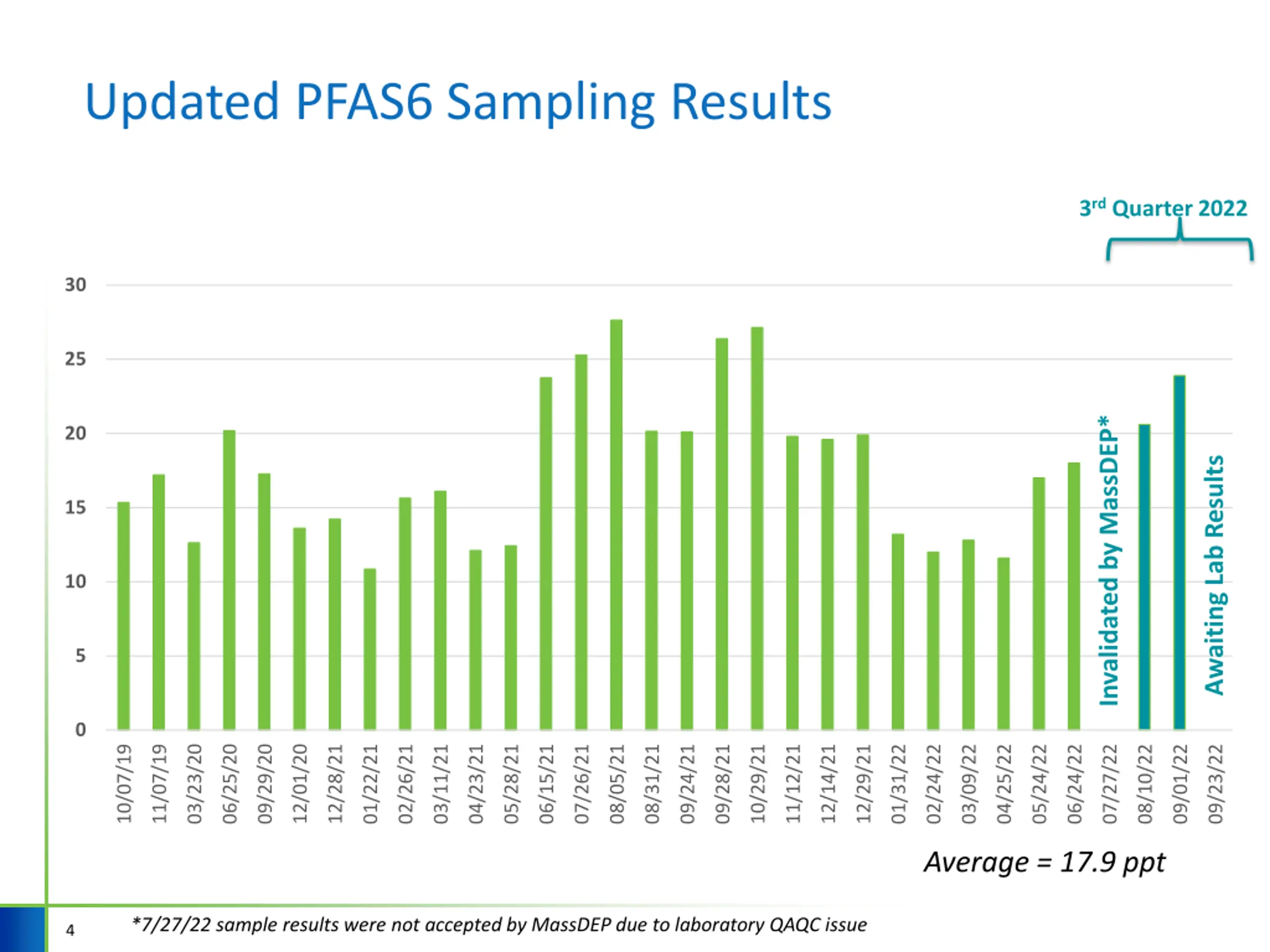Updated PFAS6 Sampling Results 3rd Quarter 2022 30 25 Invalidated by MassDEP* 20 Awaiting Lab Results 15 10 5 0 11/12/21 01/31/22 04/25/22 07/27/22 10/07/19 11/07/19 03/23/20 06/25/20 09/29/20 12/01/20 12/28/21 01/22/21 02/26/21 03/11/21 04/23/21 05/28/21 06/15/21 07/26/21 08/05/21 08/31/21 09/24/21 09/28/21 10/29/21 12/14/21 12/29/21 02/24/22 03/09/22 05/24/22 06/24/22 08/10/22 09/01/22 09/23/22 Average = 17.9 ppt *7/27/22 sample results were not accepted by MassDEP due to laboratory QAQC issue 4