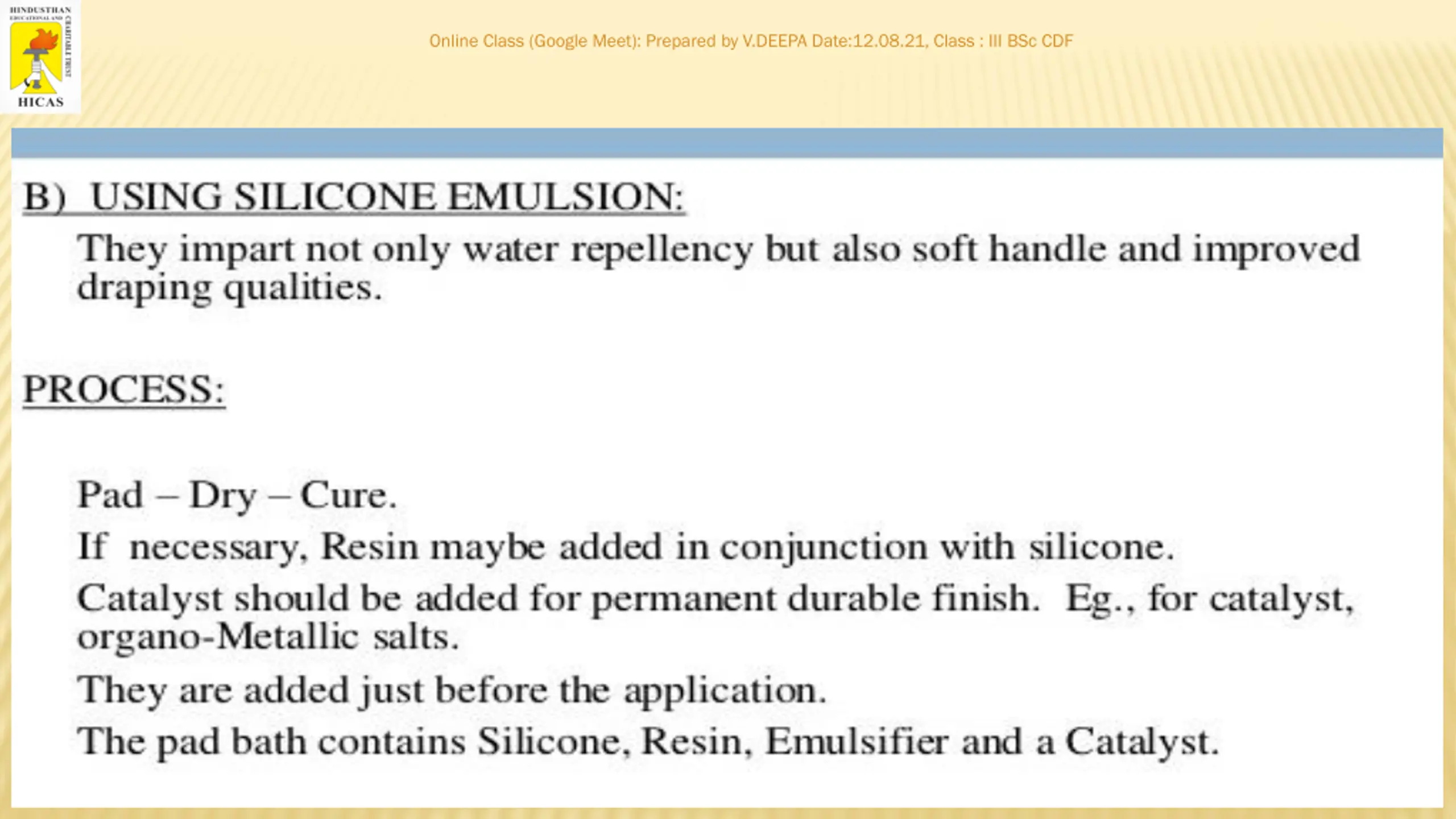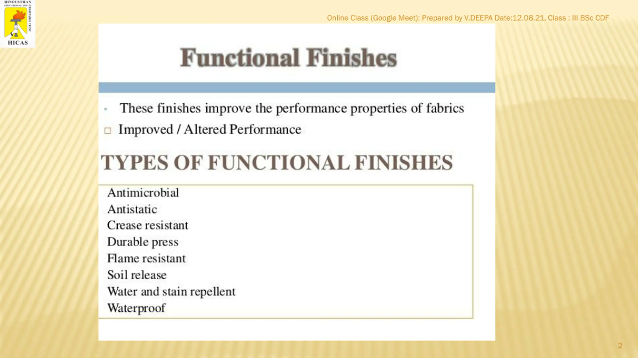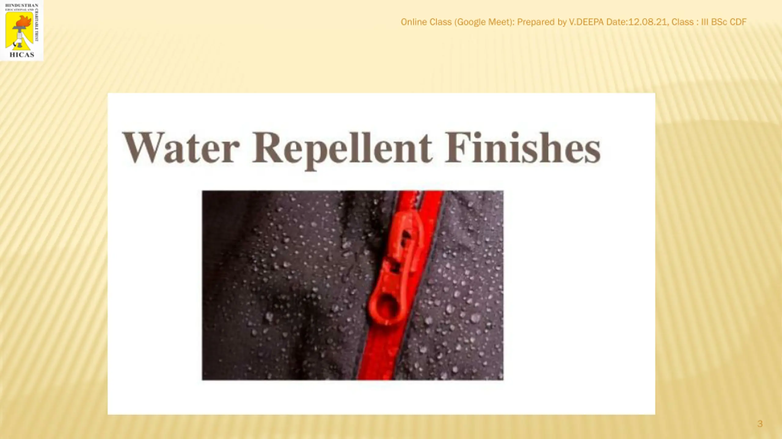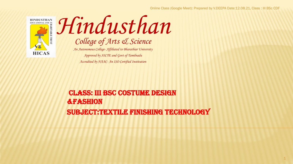 Online Class (Google Meet): Prepared by V.DEEPA Date:12.08.21, Class : III BSc CDF Hindusthan College of Arts & Science An Autonomous College- Affiliated to Bharathiar University Approved by AICTE and Govt of Tamilnadu Accredited by NAAC- An ISO Certified Institution Class: III BSc COSTUME DESIGN Class: III BSc COSTUME DESIGN &FASHION &FASHION SUBJECT:TEXTILE FINISHING TECHNOLOGY SUBJECT:TEXTILE FINISHING TECHNOLOGY 1