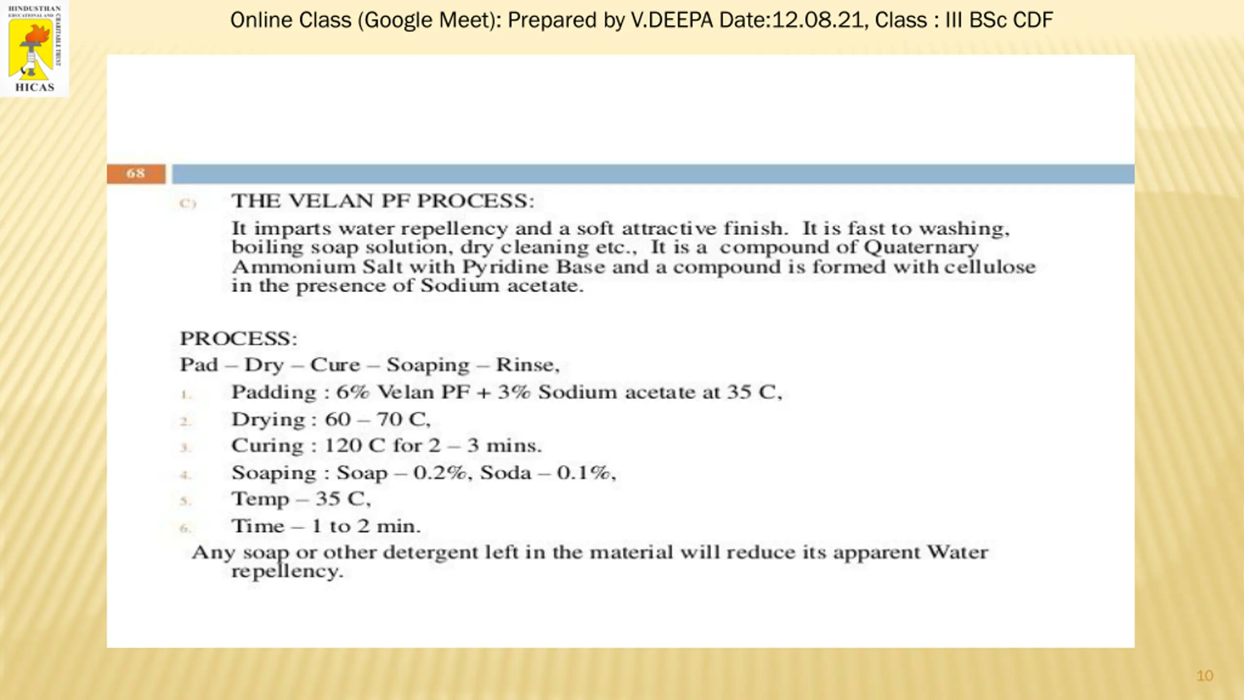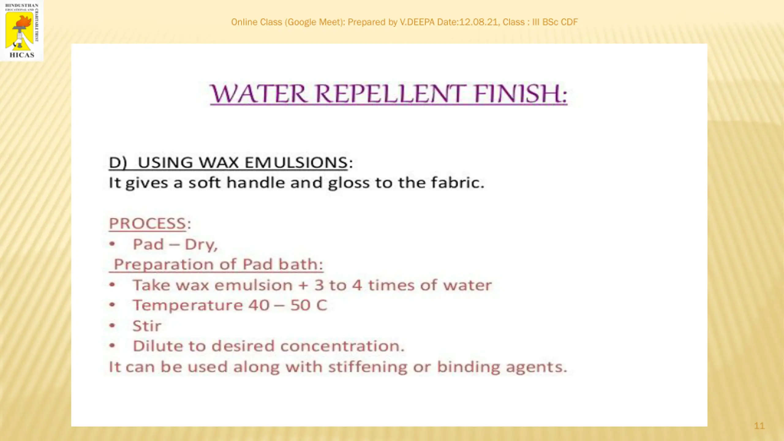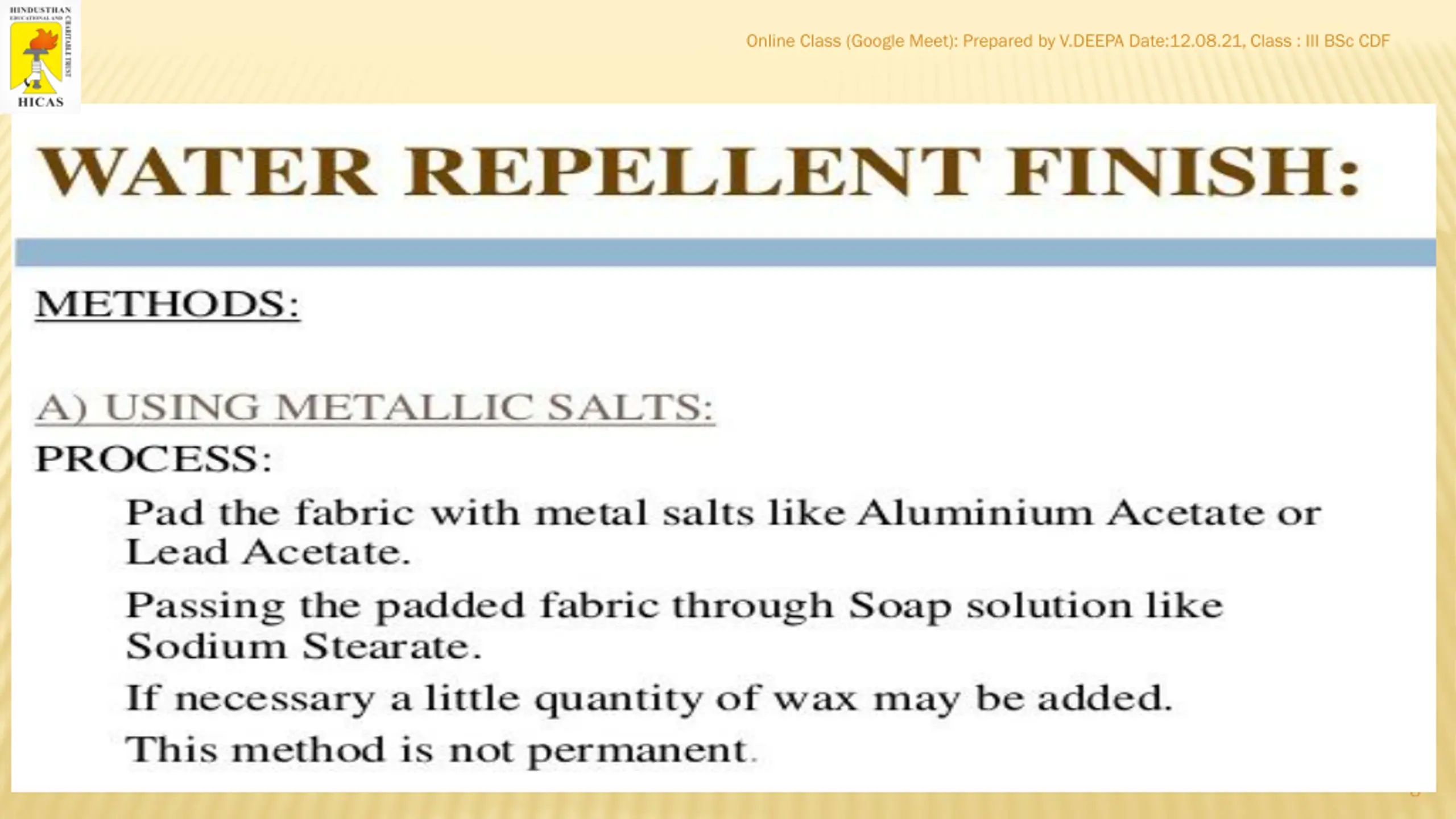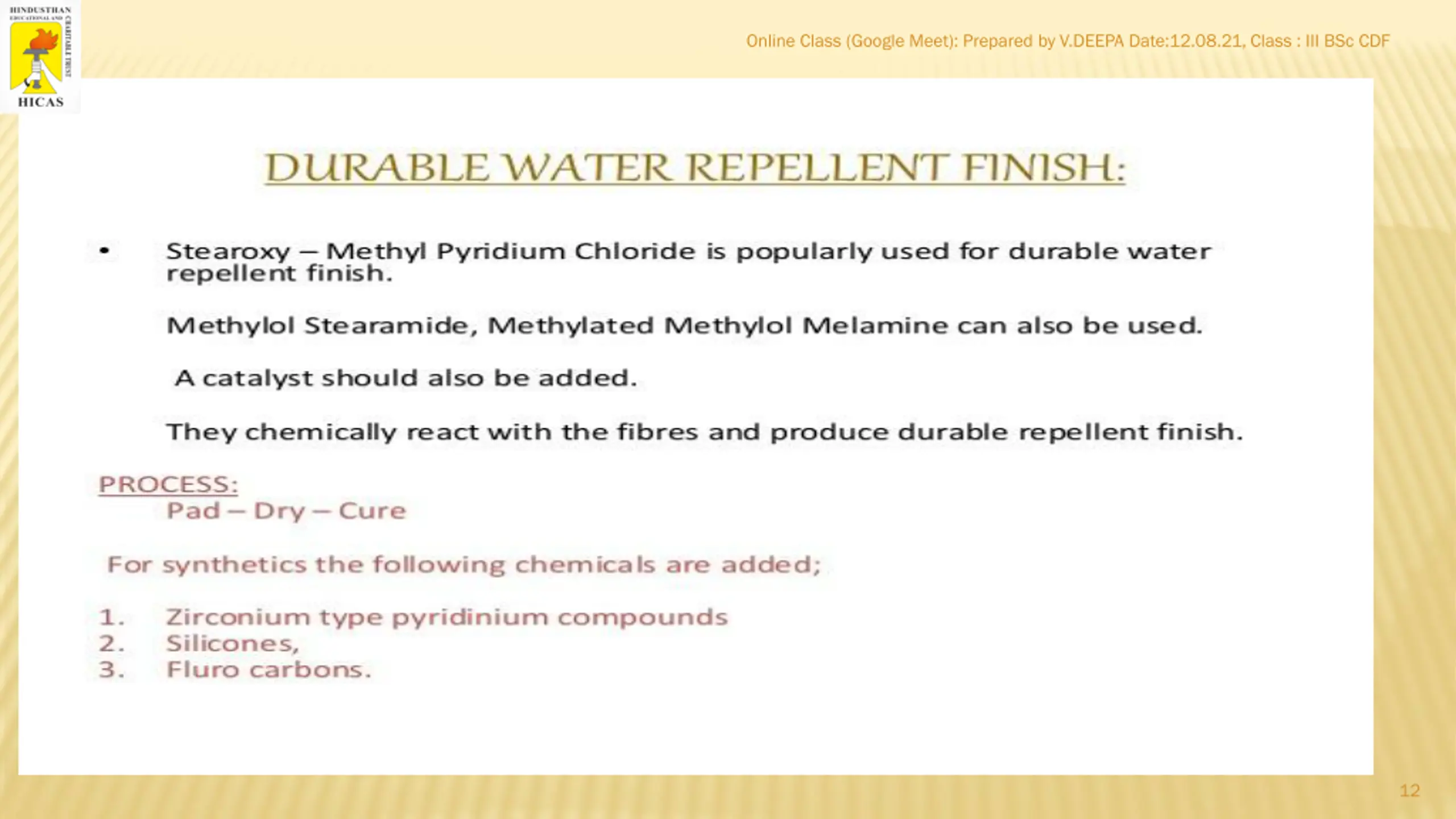Online Class (Google Meet): Prepared by V.DEEPA Date:12.08.21, Class : III BSc CDF Hindusthan College of Arts & Science An Autonomous College- Affiliated to Bharathiar University Approved by AICTE and Govt of Tamilnadu Accredited by NAAC- An ISO Certified Institution Class: III BSc COSTUME DESIGN Class: III BSc COSTUME DESIGN &FASHION &FASHION SUBJECT:TEXTILE FINISHING TECHNOLOGY SUBJECT:TEXTILE FINISHING TECHNOLOGY 1