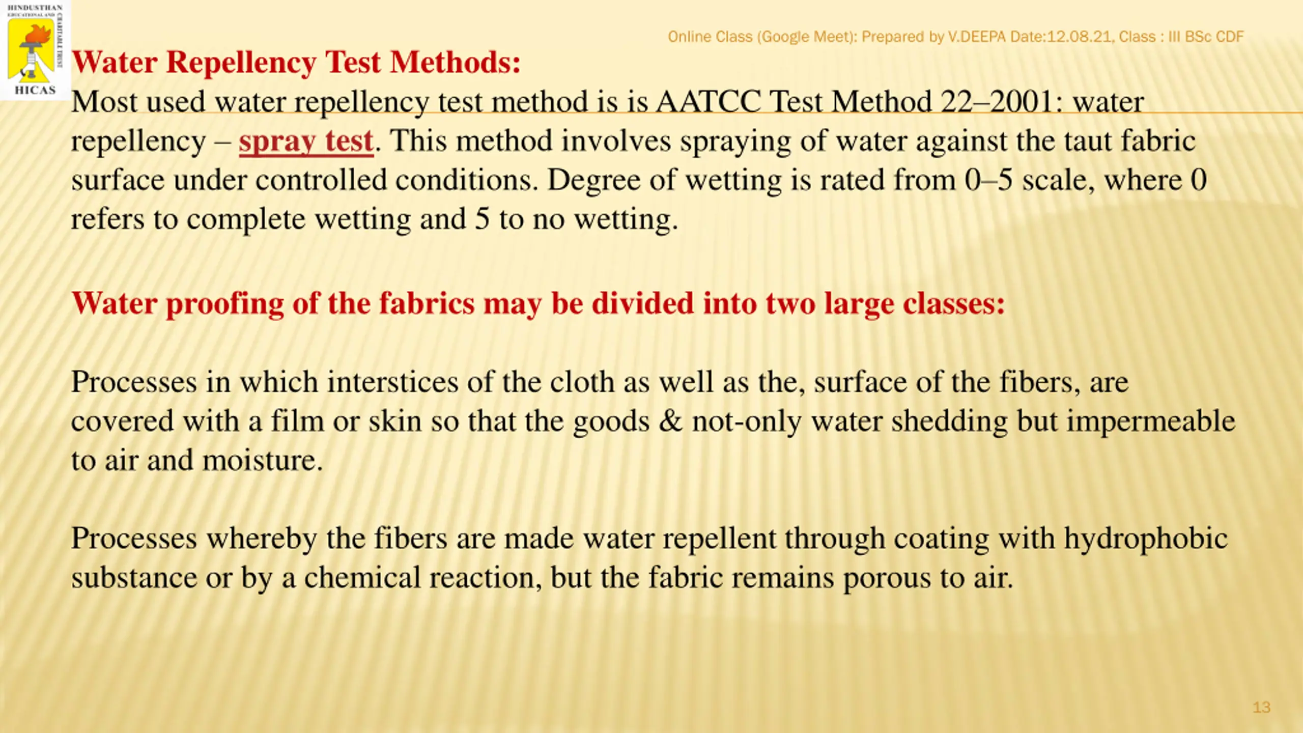 Online Class (Google Meet): Prepared by V.DEEPA Date:12.08.21, Class : III BSc CDF Water Repellency Test Methods: Most used water repellency test method is is AATCC Test Method 22 2001: water repellency spray test. This method involves spraying of water against the taut fabric surface under controlled conditions. Degree of wetting is rated from 0 5 scale, where 0 refers to complete wetting and 5 to no wetting. Water proofing of the fabrics may be divided into two large classes: Processes in which interstices of the cloth as well as the, surface of the fibers, are covered with a film or skin so that the goods & not-only water shedding but impermeable to air and moisture. Processes whereby the fibers are made water repellent through coating with hydrophobic substance or by a chemical reaction, but the fabric remains porous to air. 13