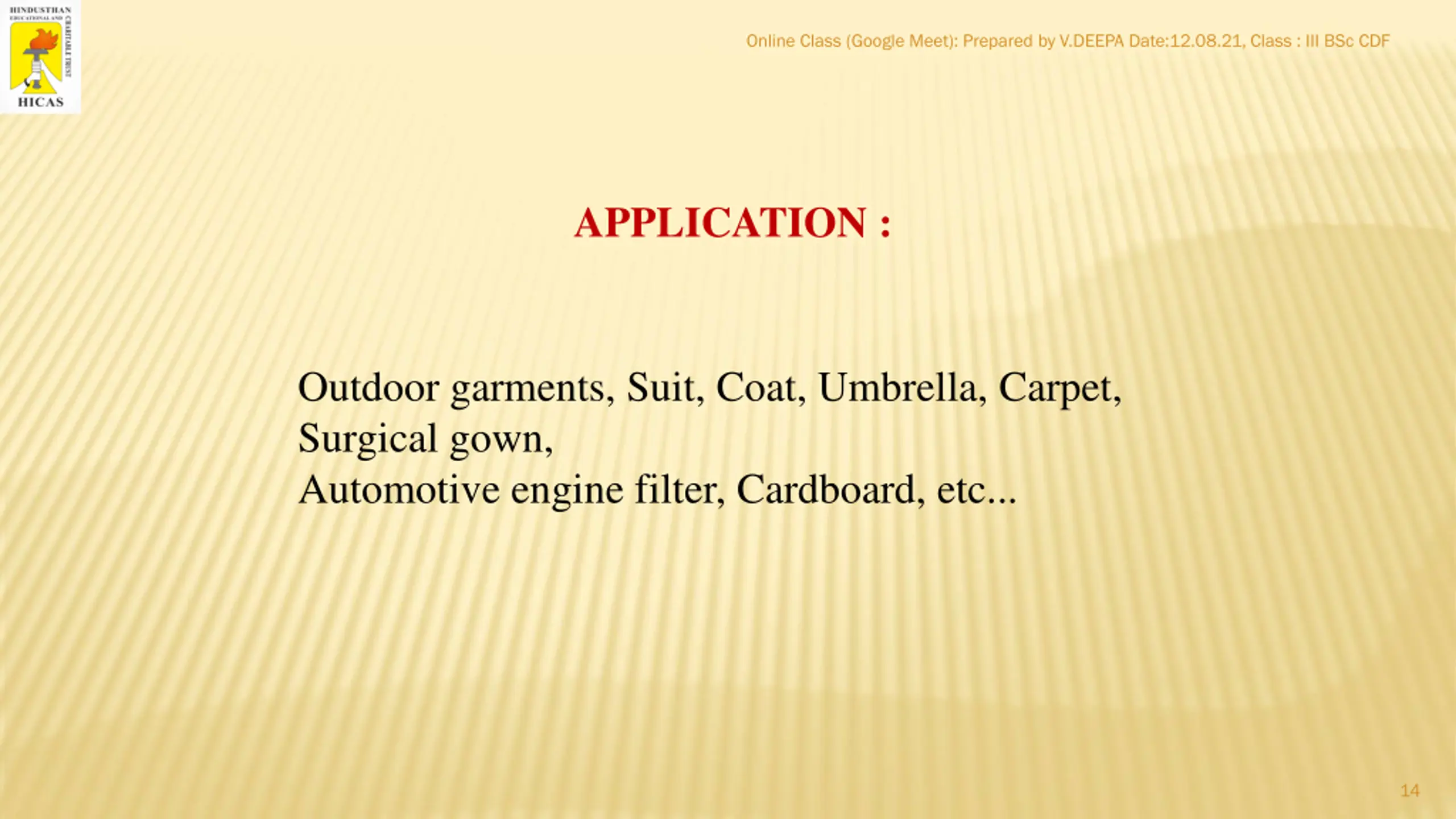 Online Class (Google Meet): Prepared by V.DEEPA Date:12.08.21, Class : III BSc CDF APPLICATION : Outdoor garments, Suit, Coat, Umbrella, Carpet, Surgical gown, Automotive engine filter, Cardboard, etc... 14