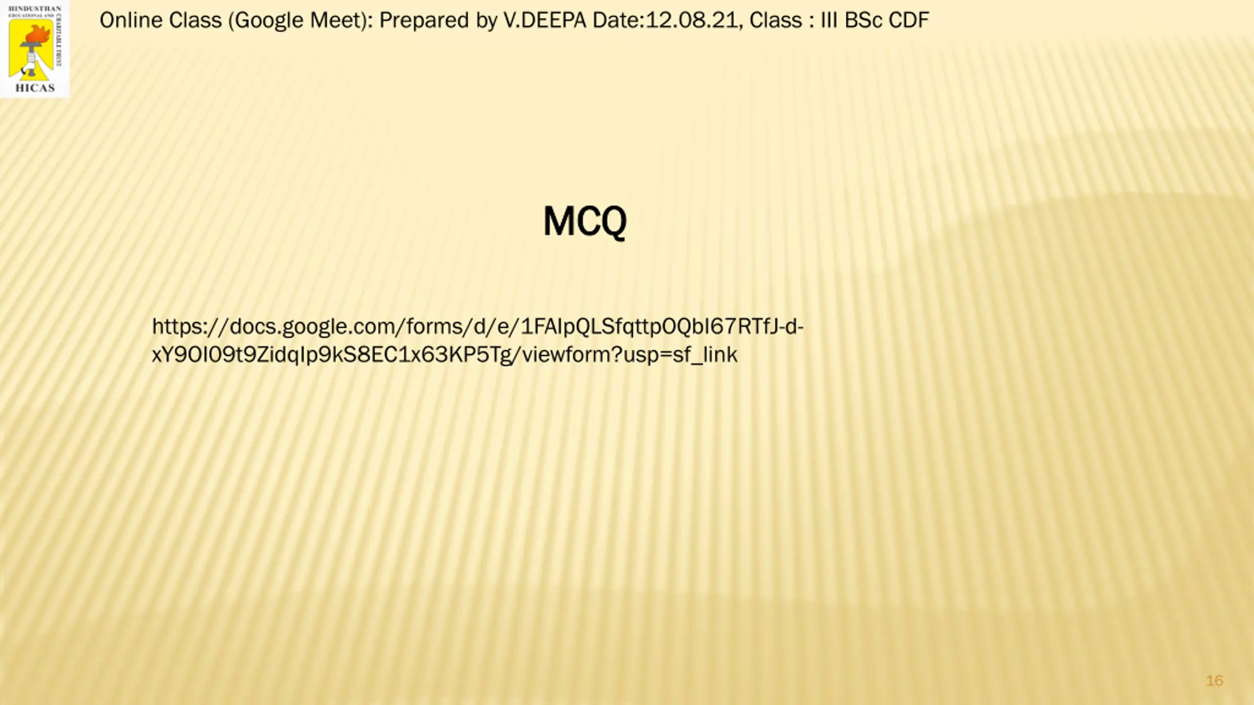 Online Class (Google Meet): Prepared by V.DEEPA Date:12.08.21, Class : III BSc CDF MCQ MCQ https://docs.google.com/forms/d/e/1FAIpQLSfqttpOQbI67RTfJ-d- xY9OI09t9ZidqIp9kS8EC1x63KP5Tg/viewform?usp=sf_link 16