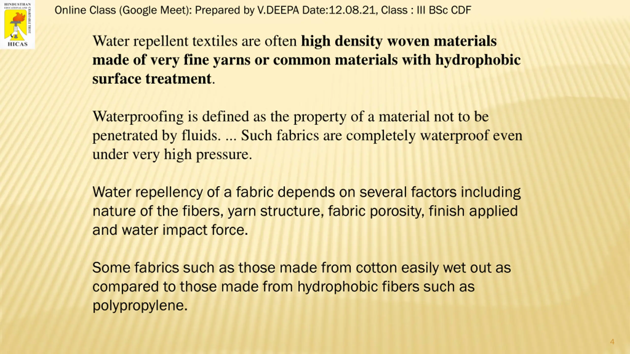 Online Class (Google Meet): Prepared by V.DEEPA Date:12.08.21, Class : III BSc CDF Water repellent textiles are often high density woven materials made of very fine yarns or common materials with hydrophobic surface treatment. Waterproofing is defined as the property of a material not to be penetrated by fluids. ... Such fabrics are completely waterproof even under very high pressure. Water repellency of a fabric depends on several factors including nature of the fibers, yarn structure, fabric porosity, finish applied and water impact force. Some fabrics such as those made from cotton easily wet out as compared to those made from hydrophobic fibers such as polypropylene. 4