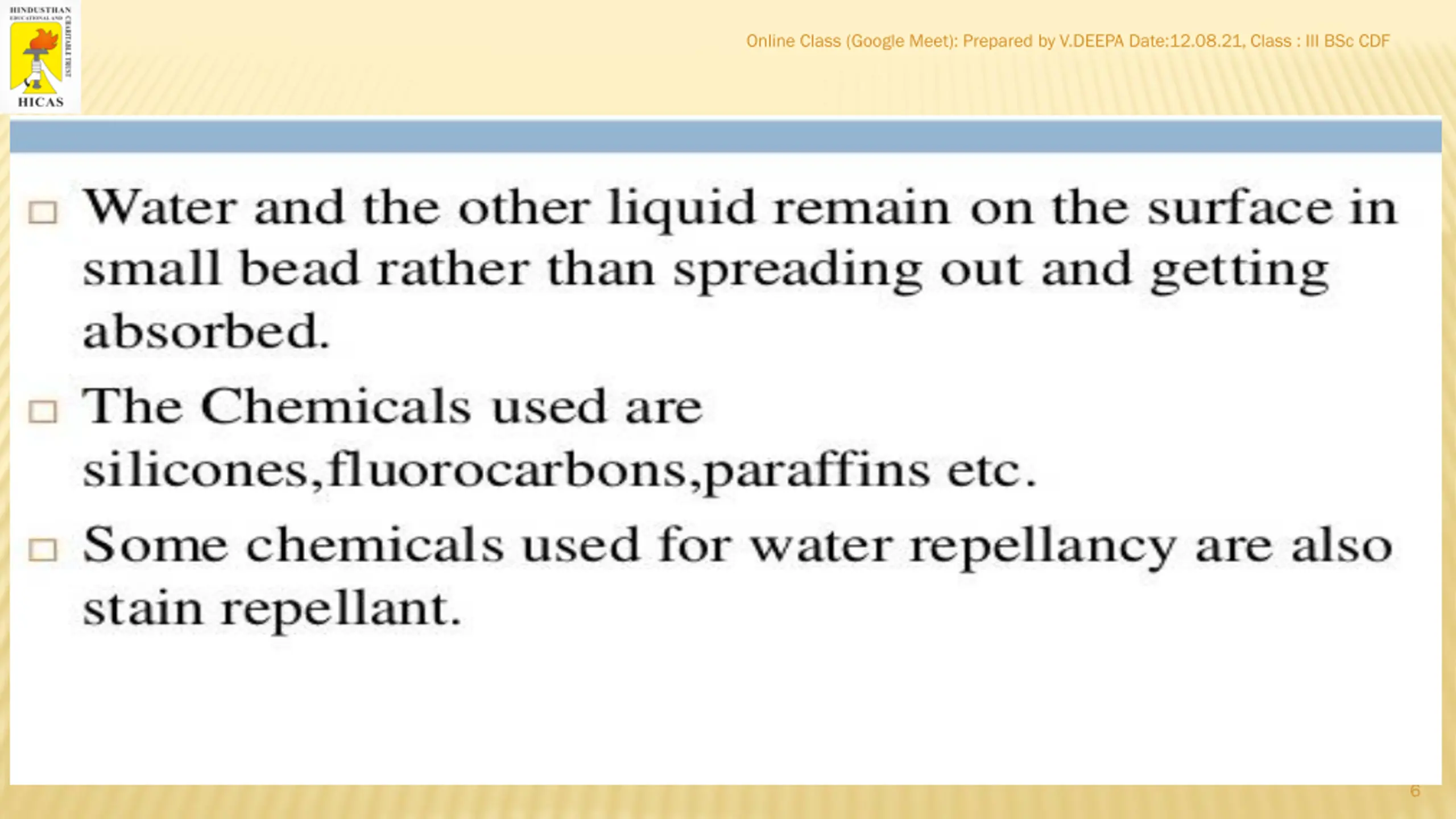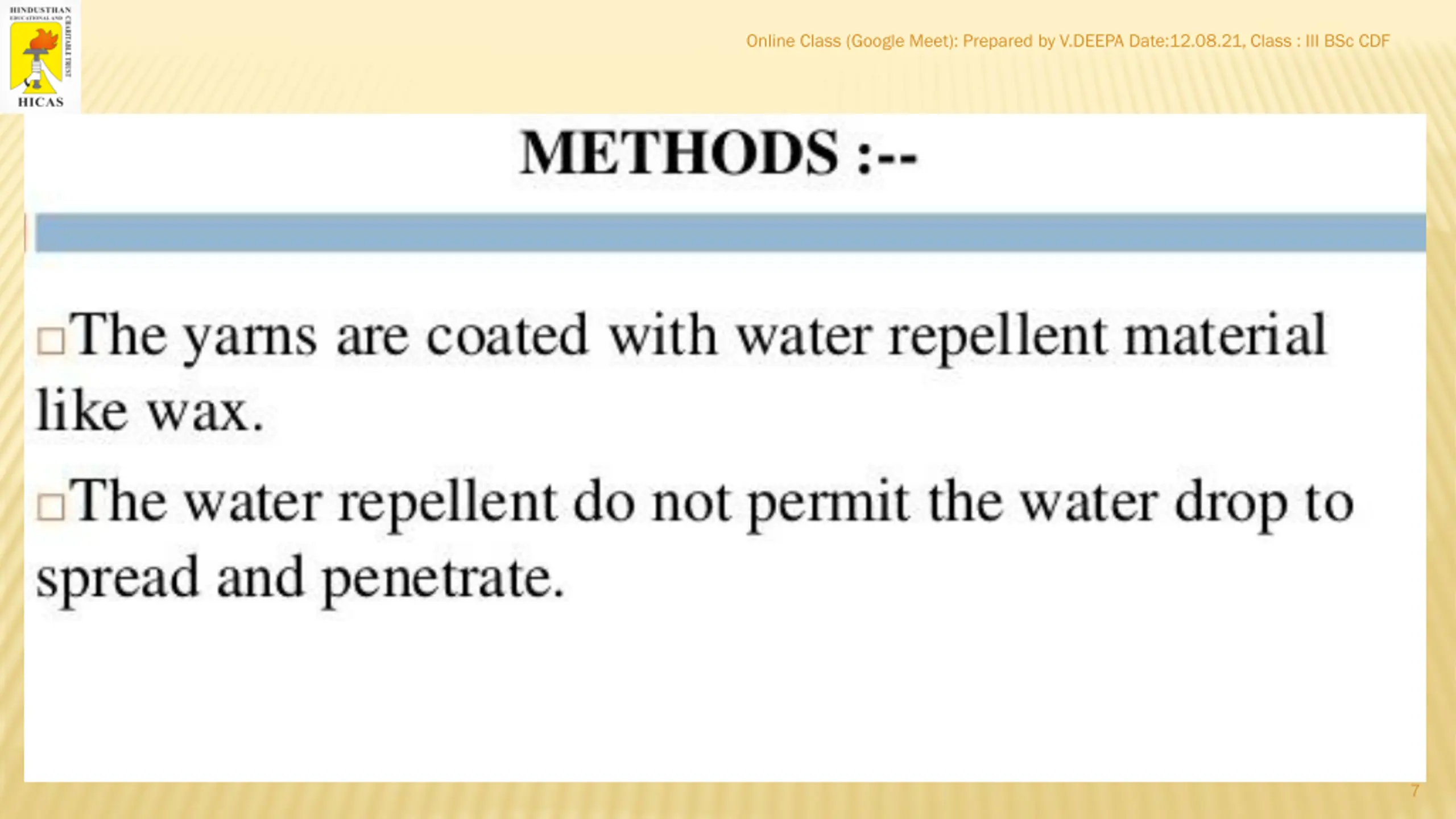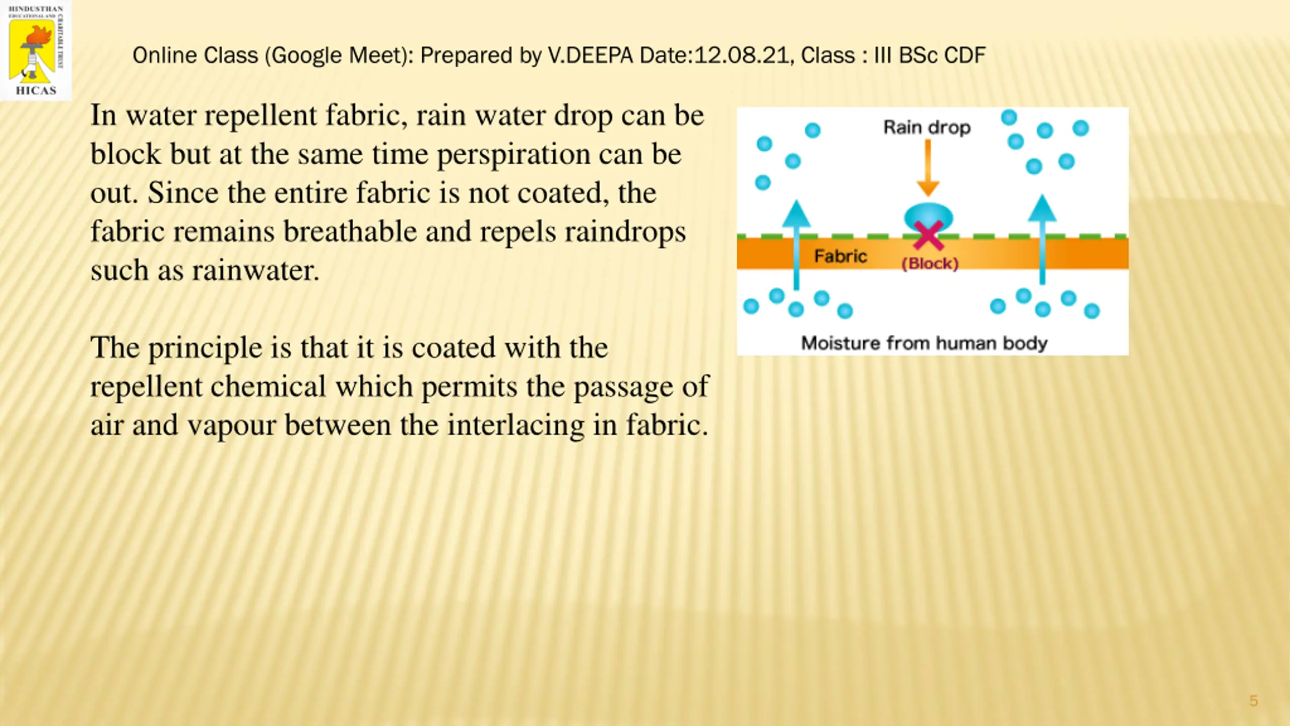 Online Class (Google Meet): Prepared by V.DEEPA Date:12.08.21, Class : III BSc CDF In water repellent fabric, rain water drop can be block but at the same time perspiration can be out. Since the entire fabric is not coated, the fabric remains breathable and repels raindrops such as rainwater. The principle is that it is coated with the repellent chemical which permits the passage of air and vapour between the interlacing in fabric. 5