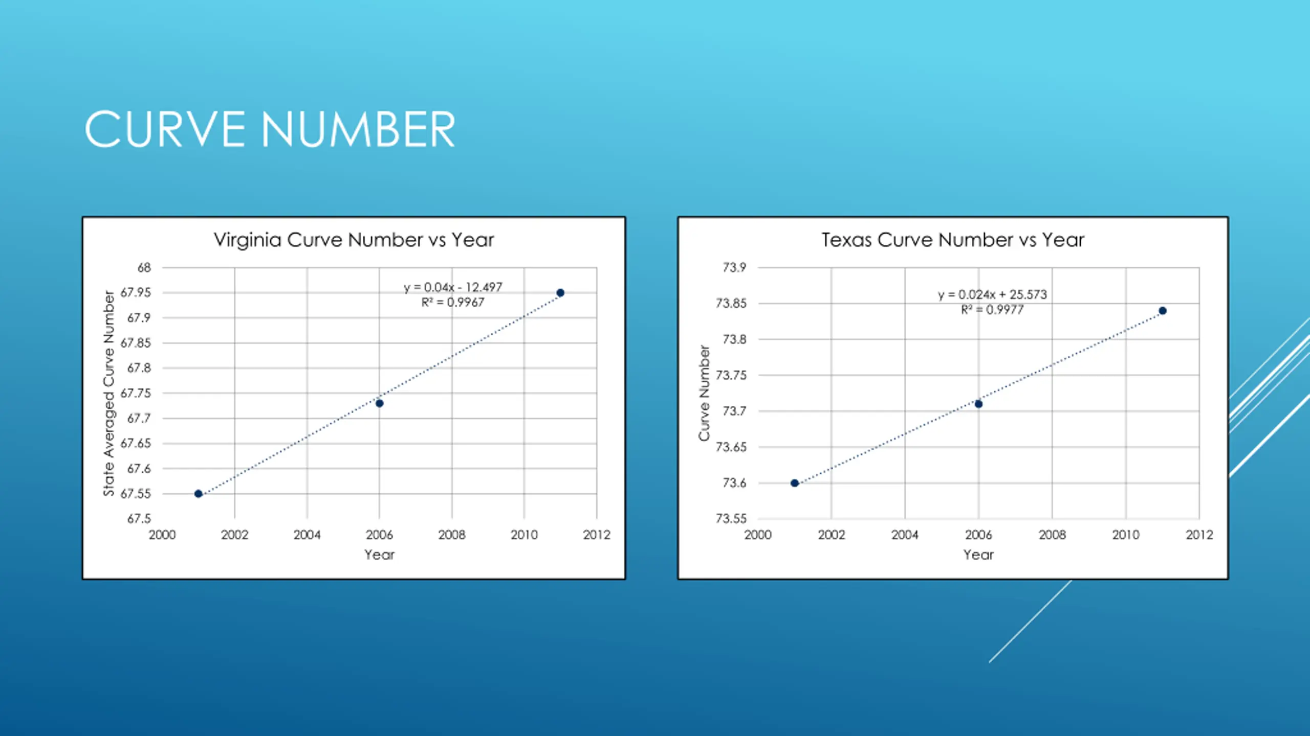 CURVE NUMBER Virginia Curve Number vs Year Texas Curve Number vs Year 68 73.9 y = 0.04x - 12.497 R = 0.9967 67.95 y = 0.024x + 25.573 R = 0.9977 State Averaged Curve Number 73.85 67.9 73.8 67.85 Curve Number 67.8 73.75 67.75 73.7 67.7 67.65 73.65 67.6 73.6 67.55 67.5 73.55 2000 2002 2004 2006 Year 2008 2010 2012 2000 2002 2004 2006 Year 2008 2010 2012