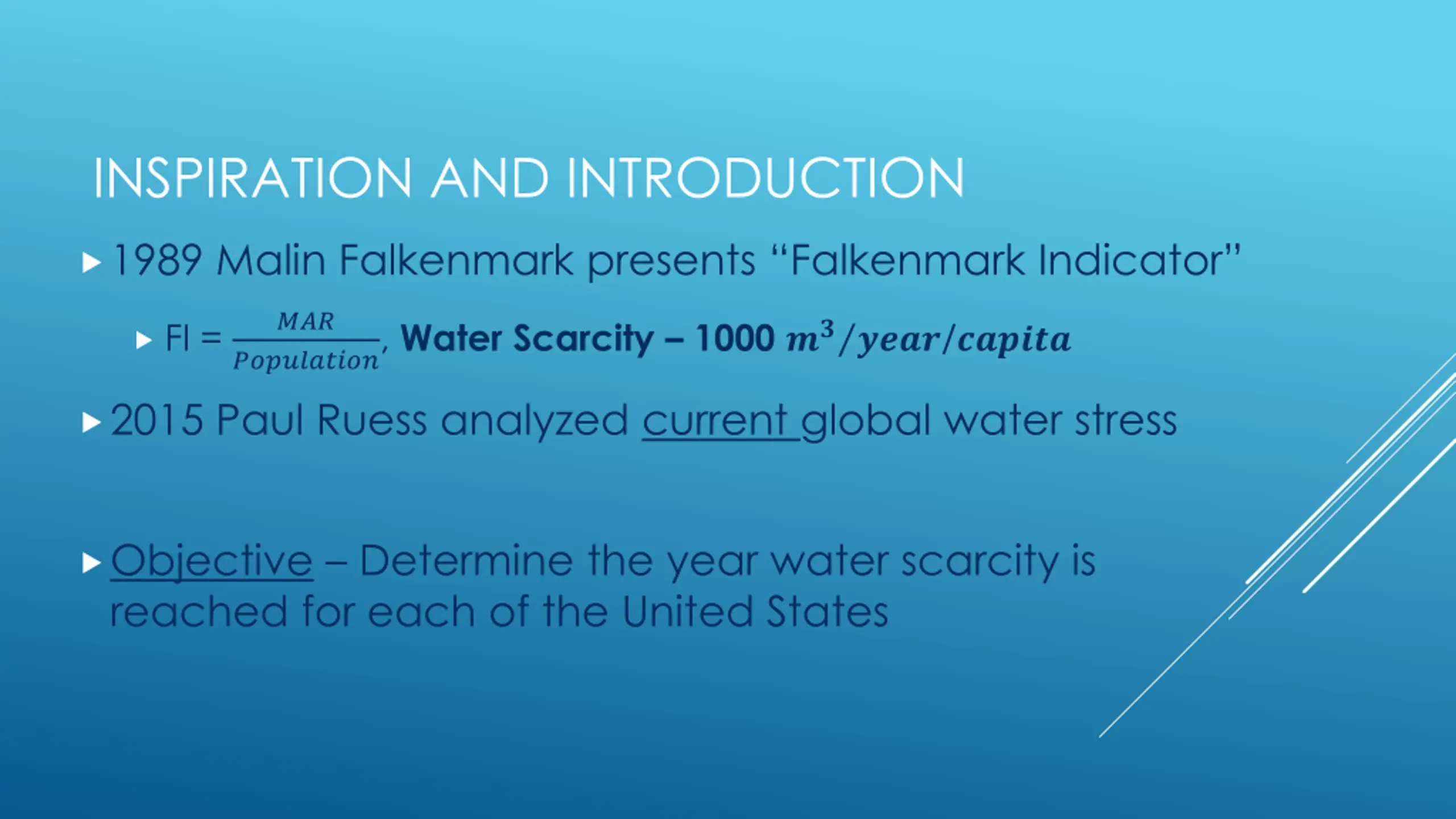 INSPIRATION AND INTRODUCTION 1989 Malin Falkenmark presents Falkenmark Indicator ??? FI = ??????????, Water Scarcity 1000 ??????/?????? 2015 Paul Ruess analyzed current global water stress Objective Determine the year water scarcity is reached for each of the United States