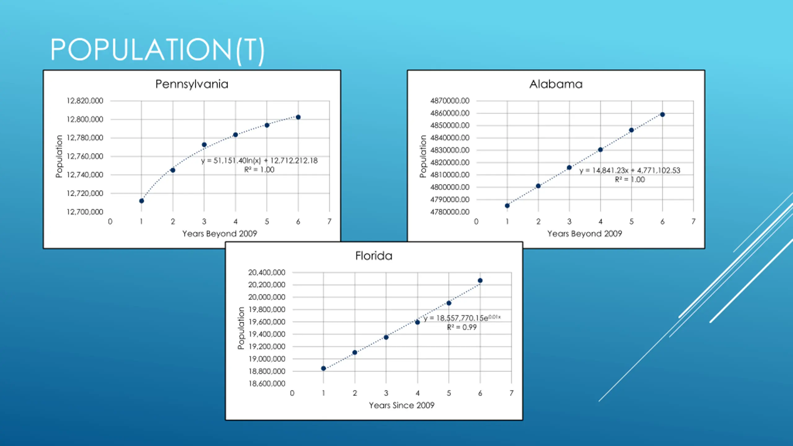 POPULATION(T) Pennsylvania Alabama 12,820,000 4870000.00 4860000.00 12,800,000 4850000.00 12,780,000 4840000.00 Population Population 4830000.00 12,760,000 y = 51,151.40ln(x) + 12,712,212.18 R = 1.00 4820000.00 y = 14,841.23x + 4,771,102.53 R = 1.00 12,740,000 4810000.00 4800000.00 12,720,000 4790000.00 12,700,000 4780000.00 0 1 2 3 4 5 6 7 0 1 2 3 4 5 6 7 Years Beyond 2009 Years Beyond 2009 Florida 20,400,000 20,200,000 20,000,000 19,800,000 Population y = 18,557,770.15e0.01x R = 0.99 19,600,000 19,400,000 19,200,000 19,000,000 18,800,000 18,600,000 0 1 2 3 4 5 6 7 Years Since 2009