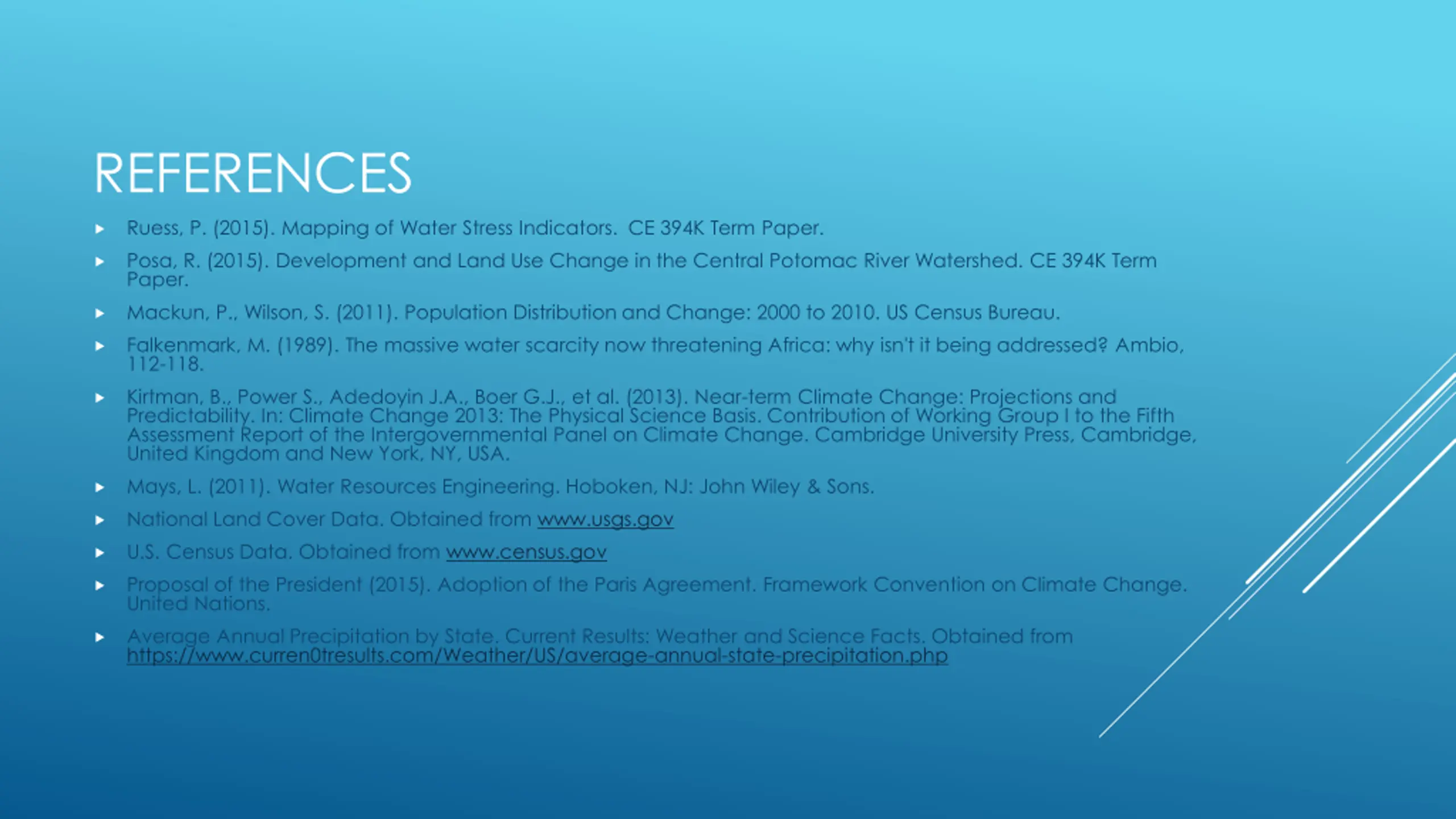 REFERENCES Ruess, P. (2015). Mapping of Water Stress Indicators. CE 394K Term Paper. Posa, R. (2015). Development and Land Use Change in the Central Potomac River Watershed. CE 394K Term Paper. Mackun, P., Wilson, S. (2011). Population Distribution and Change: 2000 to 2010. US Census Bureau. Falkenmark, M. (1989). The massive water scarcity now threatening Africa: why isn't it being addressed? Ambio, 112-118. Kirtman, B., Power S., Adedoyin J.A., Boer G.J., et al. (2013). Near-term Climate Change: Projections and Predictability. In: Climate Change 2013: The Physical Science Basis. Contribution of Working Group I to the Fifth Assessment Report of the Intergovernmental Panel on Climate Change. Cambridge University Press, Cambridge, United Kingdom and New York, NY, USA. Mays, L. (2011). Water Resources Engineering. Hoboken, NJ: John Wiley & Sons. National Land Cover Data. Obtained from www.usgs.gov U.S. Census Data. Obtained from www.census.gov Proposal of the President (2015). Adoption of the Paris Agreement. Framework Convention on Climate Change. United Nations. Average Annual Precipitation by State. Current Results: Weather and Science Facts. Obtained from https://www.curren0tresults.com/Weather/US/average-annual-state-precipitation.php