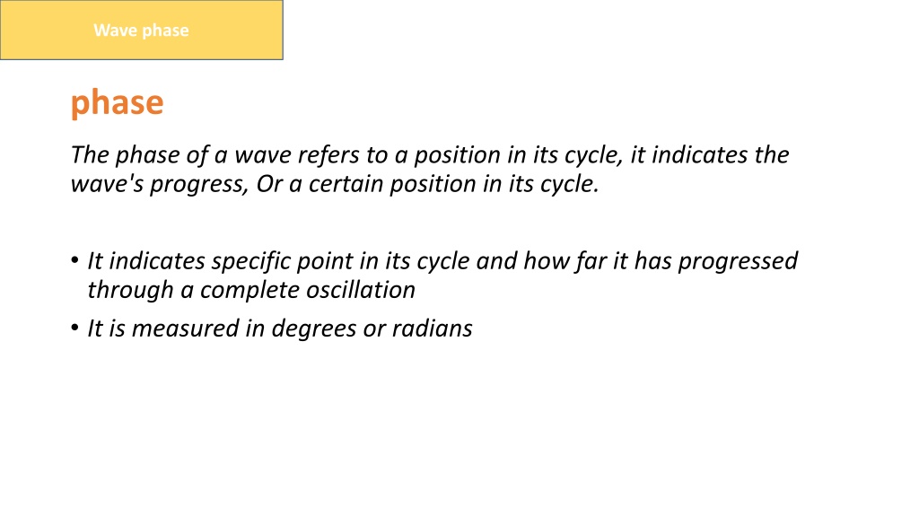 Wave phase phase The phase of a wave refers to a position in its cycle, it indicates the wave's progress, Or a certain position in its cycle. It indicates specific point in its cycle and how far it has progressed through a complete oscillation It is measured in degrees or radians