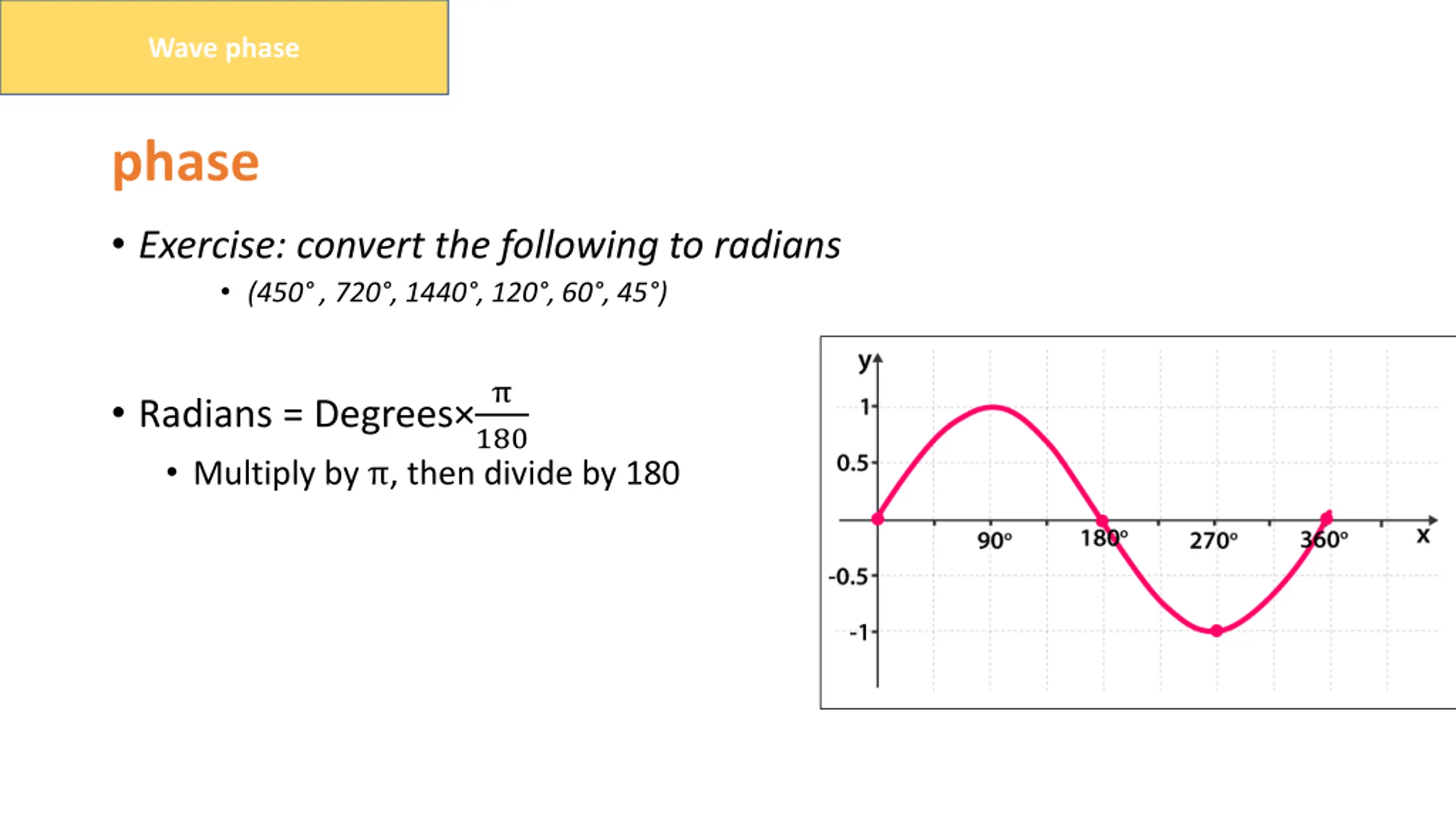 Wave phase phase Exercise: convert the following to radians (450 , 720 , 1440 , 120 , 60 , 45 ) Radians = Degrees Multiply by , then divide by 180 180