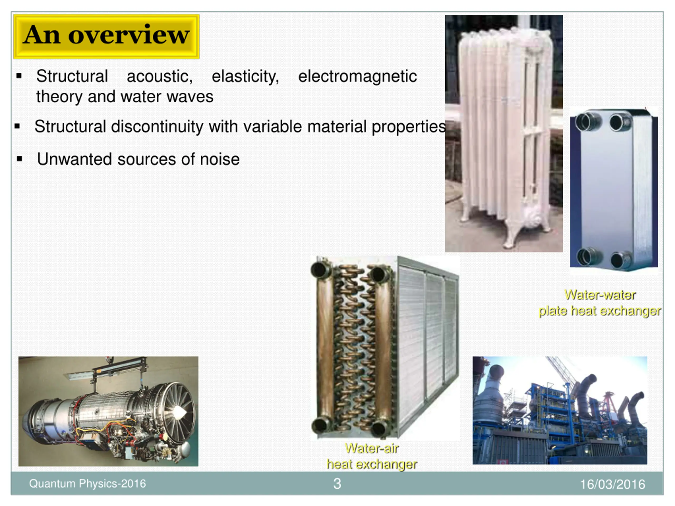 8_radiator An overview Structural acoustic, elasticity, electromagnetic theory and water waves Structural discontinuity with variable material properties Unwanted sources of noise Water-water plate heat exchanger http://www.airforce-technology.com/contractor_images/systecon/systecon1.jpg Water-air heat exchanger 3 16/03/2016 Quantum Physics-2016