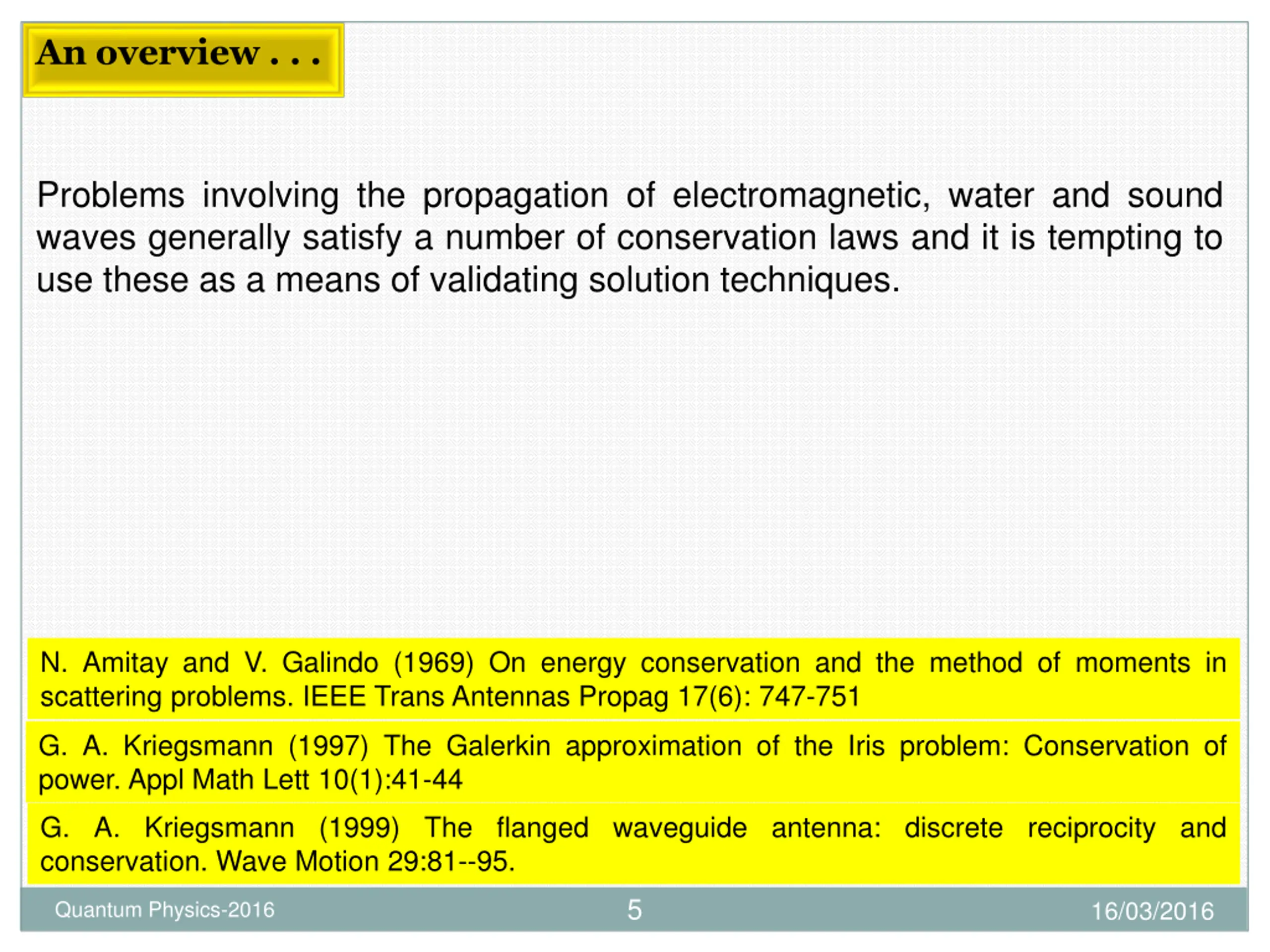 An overview . . . Problems involving the propagation of electromagnetic, water and sound waves generally satisfy a number of conservation laws and it is tempting to use these as a means of validating solution techniques. N. Amitay and V. Galindo (1969) On energy conservation and the method of moments in scattering problems. IEEE Trans Antennas Propag 17(6): 747-751 G. A. Kriegsmann (1997) The Galerkin approximation of the Iris problem: Conservation of power. Appl Math Lett 10(1):41-44 G. A. Kriegsmann (1999) The flanged waveguide antenna: discrete reciprocity and conservation. Wave Motion 29:81--95. 5 16/03/2016 Quantum Physics-2016