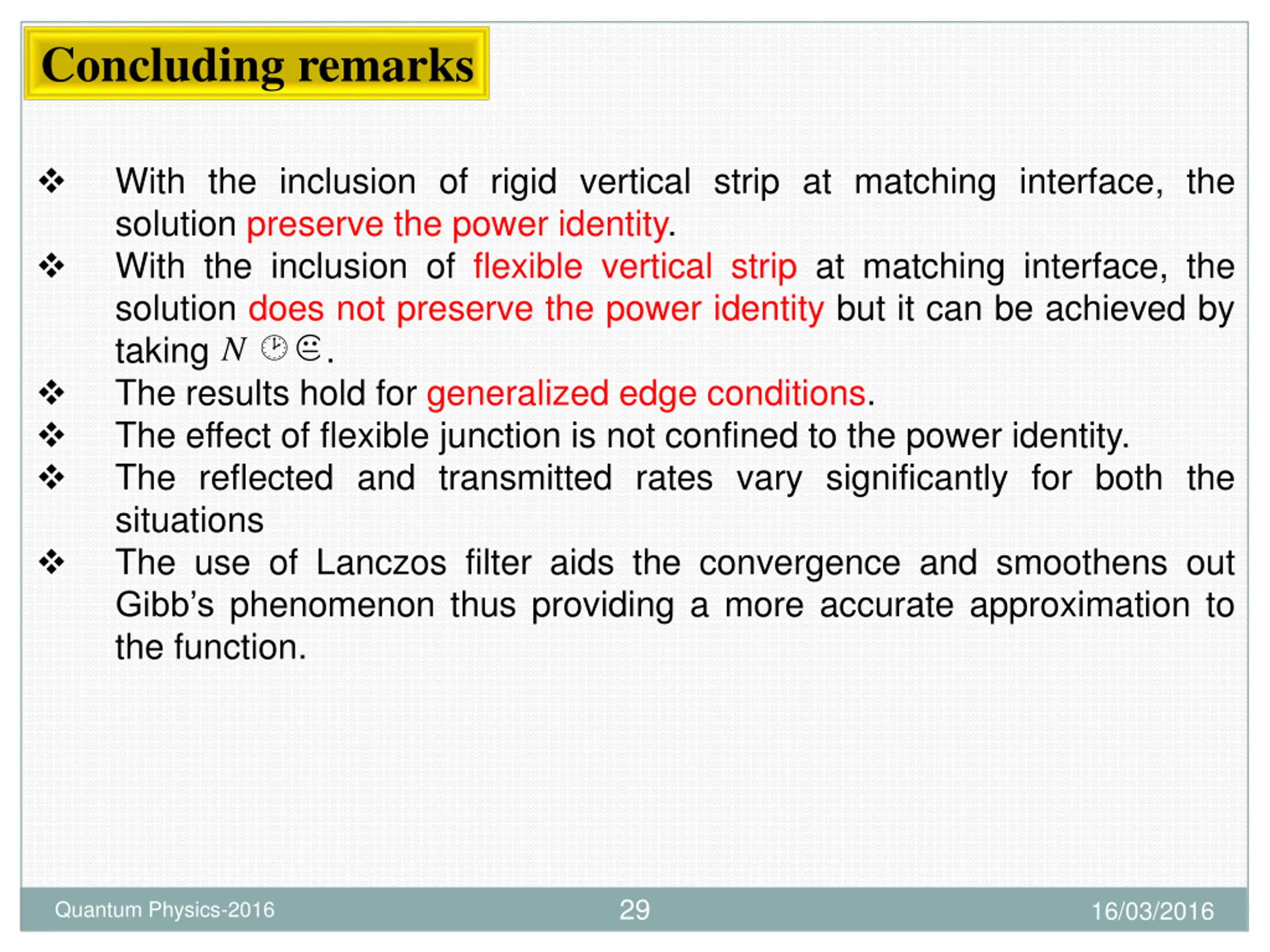 Concluding remarks With the inclusion of rigid vertical strip at matching interface, the solution preserve the power identity. With the inclusion of flexible vertical strip at matching interface, the solution does not preserve the power identity but it can be achieved by taking . The results hold for generalized edge conditions. The effect of flexible junction is not confined to the power identity. The reflected and transmitted rates vary significantly for both the situations The use of Lanczos filter aids the convergence and smoothens out Gibb s phenomenon thus providing a more accurate approximation to the function. N 29 16/03/2016 Quantum Physics-2016