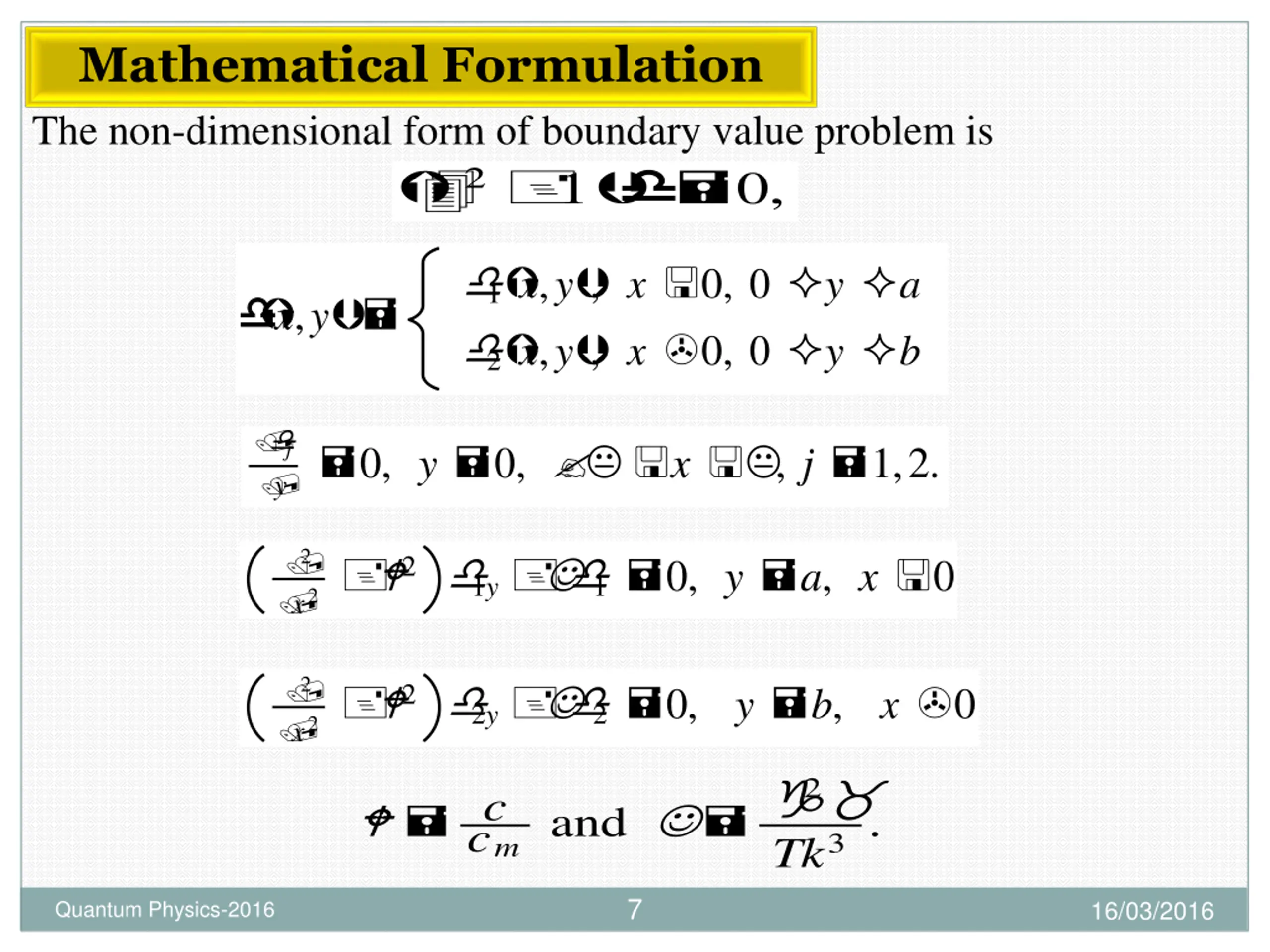 Mathematical Formulation The non-dimensional form of boundary value problem is 2 1 0, 1 x,y , x 0, 0 y a 2 x,y , x 0, 0 y b x,y j y 0, y 0, x , j 1,2. 2 x2 2 1y 1 0, y a, x 0 2 x2 2 2y 2 0, y b, x 0 cmand 2 c Tk3. # 7 16/03/2016 Quantum Physics-2016
