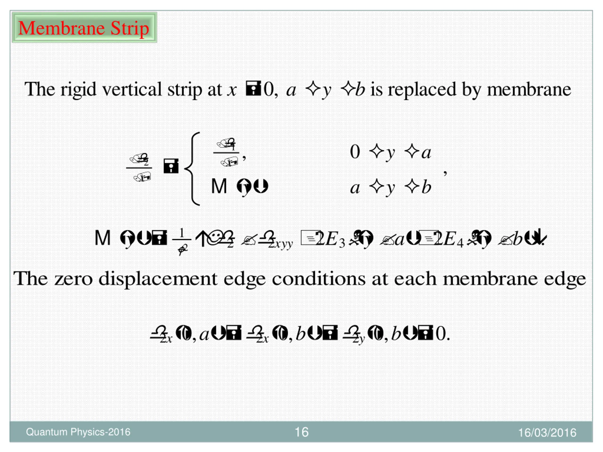 Membrane Strip The rigid vertical strip at x 0, a y b is replaced by membrane 1 M y x, 0 y a 2 x , a y b 1 M y 2 2 2xyy 2E3 y a 2E4 y b . The zero displacement edge conditions at each membrane edge 2x 0,a 2x 0,b 2y 0,b 0. 16 16/03/2016 Quantum Physics-2016