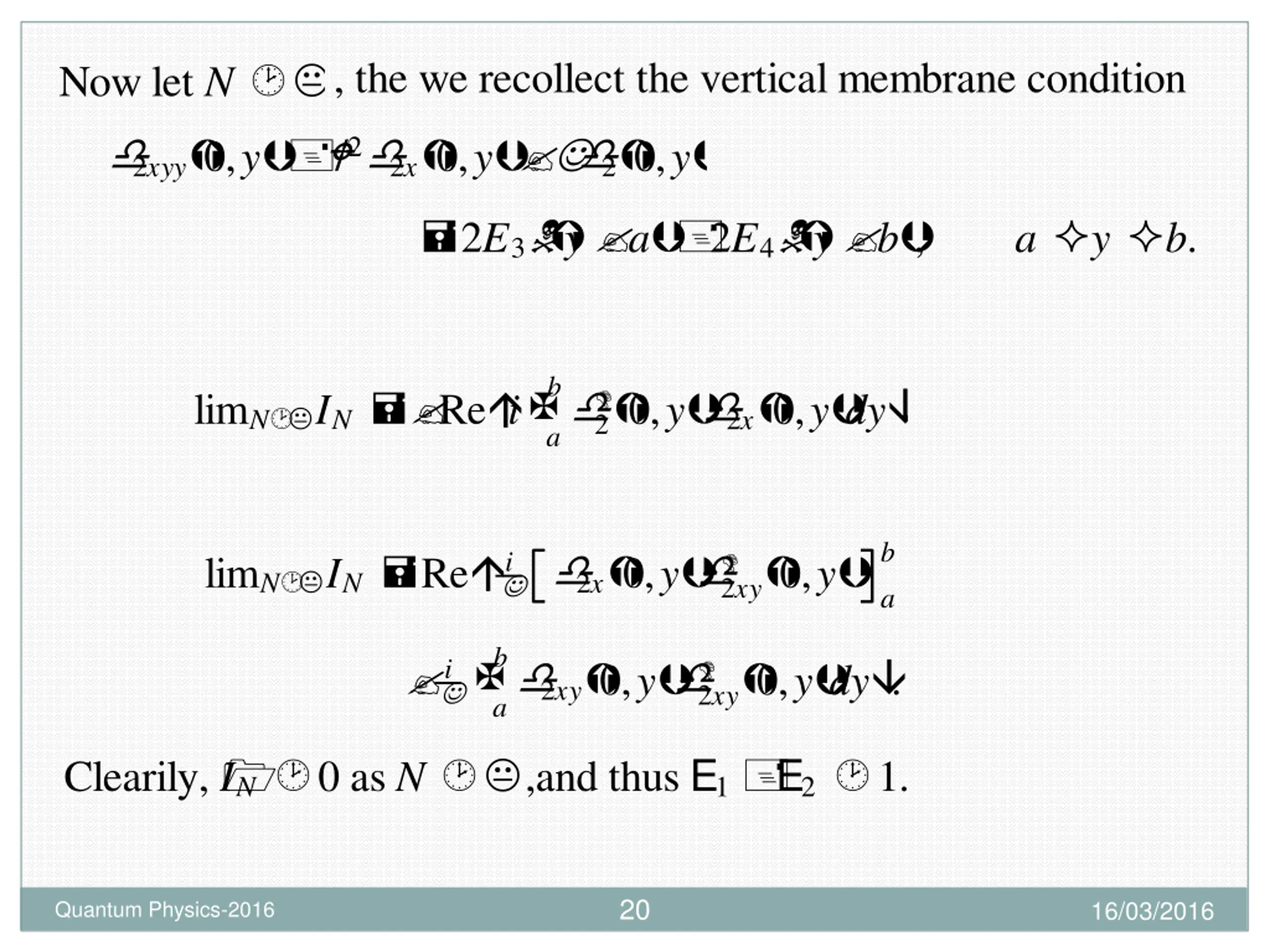 Now let N , the we recollect the vertical membrane condition 2xyy 0,y 2 2x 0,y 2 0,y 2E3 y a 2E4 y b , a y b. b 2 limN IN Re i 0,y 2x 0,y dy a b limN IN Re i 0,y a 2x 0,y 2xy b 2xy 0,y 2xy i 0,y dy . a N 0 as N ,and thus E1 E2 1. Clearily, I 20 16/03/2016 Quantum Physics-2016